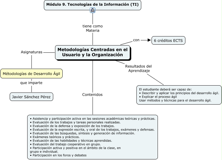 Este Cmap, tiene información relacionada con: Metodologias Agiles, Métodologías de Desarrollo Ágil que imparte Javier Sánchez Pérez, Metodologías Centradas en el Usuario y la Organización con 6 créditos ECTS, Metodologías Centradas en el Usuario y la Organización Asignaturas Métodologías de Desarrollo Ágil, Metodologías Centradas en el Usuario y la Organización Contenidos • Asistencia y participación activa en las sesiones académicas teóricas y prácticas. • Evaluación de los trabajos y tareas personales realizadas. • Evaluación de la defensa y exposición de los trabajos. • Evaluación de la expresión escrita, y oral de los trabajos, exámenes y defensas. • Evaluación de las búsquedas, síntesis y generación de información. • Exámenes teóricos y prácticos. • Evaluación de las habilidades y técnicas aprendidas. • Evaluación del trabajo cooperativo en grupo. • Participación activa y positiva en el ámbito de la clase, en grupo e individual. • Participación en los foros y debates, Metodologías Centradas en el Usuario y la Organización Resultados del Aprendizaje El estudiante deberá ser capaz de: • Describir y aplicar los principios del desarrollo ágil. • Explicar el proceso ágil Usar métodos y técnicas para el desarrollo ágil., Módulo 9. Tecnologías de la Información (TI) tiene como Materia Metodologías Centradas en el Usuario y la Organización