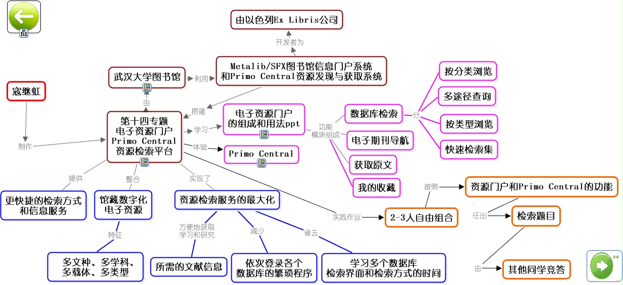 此概念图以 IHMC CmapTools 创建, 内含信息有关于: 第十四专题 电子资源门户2012信管, 电子资源门户 的组成和用法ppt 功能 模块组成 数据库检索, 第十四专题 电子资源门户 Primo Central 资源检索平台 学习 电子资源门户 的组成和用法ppt, 2-3人自由组合 按照 资源门户和Primo Central的功能, 第十四专题 电子资源门户 Primo Central 资源检索平台 整合 馆藏数字化 电子资源, 第十四专题 电子资源门户 Primo Central 资源检索平台 提供 更快捷的检索方式 和信息服务, 第十四专题 电子资源门户 Primo Central 资源检索平台 实践作业 2-3人自由组合, 资源门户和Primo Central的功能 任出 检索题目, 数据库检索 分 按类型浏览, 数据库检索 分 多途径查询, Metalib/SFX图书馆信息门户系统 和Primo Central资源发现与获取系统 开发者为 由以色列Ex Libris公司, 寇继虹 制作 第十四专题 电子资源门户 Primo Central 资源检索平台, 第十四专题 电子资源门户 Primo Central 资源检索平台 体验 Primo Central, 资源检索服务的最大化 省去 学习多个数据库 检索界面和检索方式的时间, 馆藏数字化 电子资源 特征 多文种、多学科、 多载体、多类型, 第十四专题 电子资源门户 Primo Central 资源检索平台 由 武汉大学图书馆, 数据库检索 分 快速检索集, 电子资源门户 的组成和用法ppt 功能 模块组成 获取原文, 资源检索服务的最大化 方便地获取 学习和研究 所需的文献信息, 电子资源门户 的组成和用法ppt 功能 模块组成 我的收藏, 第十四专题 电子资源门户 Primo Central 资源检索平台 实现了 资源检索服务的最大化