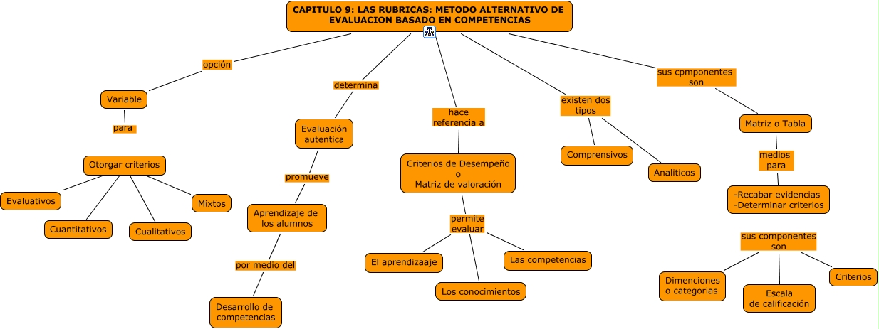 Este Cmap, tiene información relacionada con: CAPITULO 9 LAS RUBRICAS METODO ALTERNATIVO DE EVALUACION BASADA EN COMPETENCIAS, Matriz o Tabla medios para -Recabar evidencias -Determinar criterios, -Recabar evidencias -Determinar criterios sus componentes son Criterios, Criterios de Desempeño o Matriz de valoración permite evaluar Las competencias, CAPITULO 9: LAS RUBRICAS: METODO ALTERNATIVO DE EVALUACION BASADO EN COMPETENCIAS hace referencia a Criterios de Desempeño o Matriz de valoración, CAPITULO 9: LAS RUBRICAS: METODO ALTERNATIVO DE EVALUACION BASADO EN COMPETENCIAS existen dos tipos Comprensivos, Evaluación autentica promueve Aprendizaje de los alumnos, Criterios de Desempeño o Matriz de valoración permite evaluar Los conocimientos, CAPITULO 9: LAS RUBRICAS: METODO ALTERNATIVO DE EVALUACION BASADO EN COMPETENCIAS determina Evaluación autentica, -Recabar evidencias -Determinar criterios sus componentes son Dimenciones o categorias, CAPITULO 9: LAS RUBRICAS: METODO ALTERNATIVO DE EVALUACION BASADO EN COMPETENCIAS sus cpmponentes son Matriz o Tabla, Aprendizaje de los alumnos por medio del Desarrollo de competencias, -Recabar evidencias -Determinar criterios sus componentes son Escala de calificación, Criterios de Desempeño o Matriz de valoración permite evaluar El aprendizaaje, Otorgar criterios ? Cuantitativos, CAPITULO 9: LAS RUBRICAS: METODO ALTERNATIVO DE EVALUACION BASADO EN COMPETENCIAS existen dos tipos Analiticos, Otorgar criterios ? Mixtos, Variable para Otorgar criterios, CAPITULO 9: LAS RUBRICAS: METODO ALTERNATIVO DE EVALUACION BASADO EN COMPETENCIAS opción Variable, Otorgar criterios ? Evaluativos, Otorgar criterios ? Cualitativos