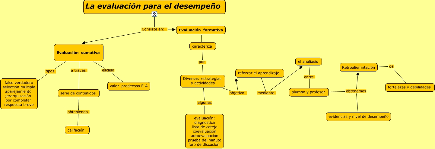 Este Cmap, tiene información relacionada con: CAPITULO-8, Retroaliemntación de fortelezas y debilidades, el analiasis entre alumno y profesor, Evaluación sumativa a traves serie de contenidos, serie de contenidos obteniendo califación, Diversas estrategias y actividades objetivo reforzar el aprendizaje, La evaluación para el desempeño Consiste en: Evaluación formativa, alumno y profesor obtenemos evidencias y nivel de desempeño, alumno y profesor obtenemos Retroaliemntación, reforzar el aprendizaje mediante el analiasis, La evaluación para el desempeño Consiste en: Evaluación sumativa, Evaluación formativa caracteriza, Evaluación sumativa tipos falso verdadero selección multiple aparejamiento jerarquización por completar respuesta breve, caracteriza por Diversas estrategias y actividades, Diversas estrategias y actividades algunas evaluación: diagnostica lista de cotejo coevaluación autoevaluación prueba del minuto foro de discución, Evaluación sumativa escaso valor prodecoso E-A