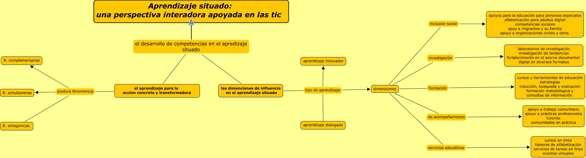 Este Cmap, tiene información relacionada con: CAPITULO-11, Aprendizaje situado: una perspectiva interadora apoyada en las tic el desarrollo de competencias en el apredizaje situado las dimenciones de influencia en el aprendizaje situado, dimensiones investigación laboratorios de investigación investigación de tendencias fortalecimiento en el acervo documental digital en diversos formatos, el aprendizaje para la accion concreta y transformadora postura fenomenica R. complementarias, Aprendizaje situado: una perspectiva interadora apoyada en las tic el desarrollo de competencias en el apredizaje situado el aprendizaje para la accion concreta y transformadora, dimensiones inclusion social apoyos para la educación para personas especiales alfabetización para adultos digital competencias sociales apoy a migrantes y su familia apoyo a organizaciones civiles y otros., dimensiones formación cursos y herramientas de educación estrategias inducción, busqueda y evaluación formación metodologica y consultas de información., las dimenciones de influencia en el aprendizaje situado tipo de aprendizaje aprendizaje dialogado, dimensiones de acompañamiento apoyo a trabajo comunitario apoyo a prácticas profesionales tutorias comunidades en práctica, las dimenciones de influencia en el aprendizaje situado tipo de aprendizaje aprendizaje innovador, el aprendizaje para la accion concreta y transformadora postura fenomenica R. antagonicas., las dimenciones de influencia en el aprendizaje situado tipo de aprendizaje dimensiones, dimensiones servicios educativos cursos en linea taleeres de alfabetización servicios de tareas en linea eventos virtuales, el aprendizaje para la accion concreta y transformadora postura fenomenica R. simultanenas