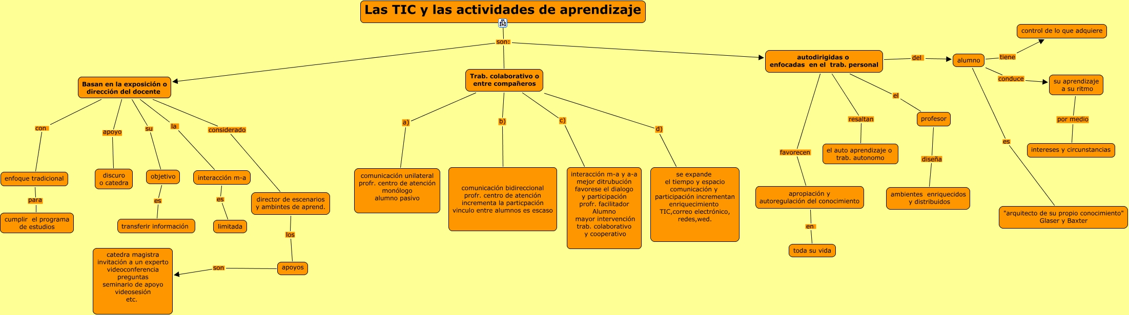 Este Cmap, tiene información relacionada con: CAPITULO-7, autodirigidas o enfocadas en el trab. personal resaltan el auto aprendizaje o trab. autonomo, Trab. colaborativo o entre compañeros d) se expande el tiempo y espacio comunicación y participación incrementan enriquecimiento TIC,correo electrónico, redes,wed., autodirigidas o enfocadas en el trab. personal el profesor, Trab. colaborativo o entre compañeros c) interacción m-a y a-a mejor ditrubución favorese el dialogo y participación profr. facilitador Alumno mayor intervención trab. colaborativo y cooperativo, alumno tiene control de lo que adquiere, profesor diseña ambientes enriquecidos y distribuidos, Las TIC y las actividades de aprendizaje son: Basan en la exposición o dirección del docente, autodirigidas o enfocadas en el trab. personal del alumno, Basan en la exposición o dirección del docente apoyo discuro o catedra, Basan en la exposición o dirección del docente su objetivo, Las TIC y las actividades de aprendizaje son: autodirigidas o enfocadas en el trab. personal, objetivo es transferir información, director de escenarios y ambintes de aprend. los apoyos, interacción m-a es limitada, enfoque tradicional para cumplir el programa de estudios, alumno conduce su aprendizaje a su ritmo, apoyos son catedra magistra invitación a un experto videoconferencia preguntas seminario de apoyo videosesión etc., Las TIC y las actividades de aprendizaje son: Trab. colaborativo o entre compañeros, apropiación y autoregulación del conocimiento en toda su vida, Basan en la exposición o dirección del docente con enfoque tradicional