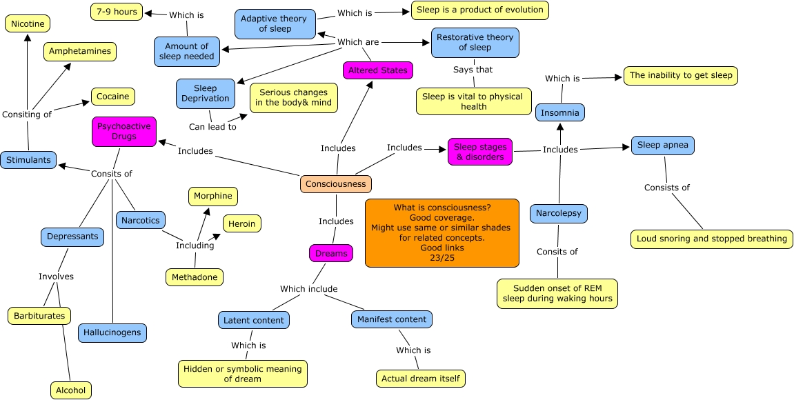 This Concept Map, created with IHMC CmapTools, has information related to: VanBuren Ch 4 23, Sleep stages & disorders Includes Narcolepsy, Consciousness Includes Dreams, Restorative theory of sleep Says that Sleep is vital to physical health, Psychoactive Drugs Consits of Depressants, Narcolepsy Consits of Sudden onset of REM sleep during waking hours, Stimulants Consiting of Amphetamines, Psychoactive Drugs Consits of Stimulants, Sleep apnea Consists of Loud snoring and stopped breathing, Altered States Which are Adaptive theory of sleep, Depressants Involves Barbiturates, Depressants Involves Alcohol, Stimulants Consiting of Nicotine, Latent content Which is Hidden or symbolic meaning of dream, Consciousness Includes Altered States, Sleep stages & disorders Includes Sleep apnea, Dreams Which include Manifest content, Narcotics Including Morphine, Manifest content Which is Actual dream itself, Amount of sleep needed Which is 7-9 hours, Narcotics Including Methadone