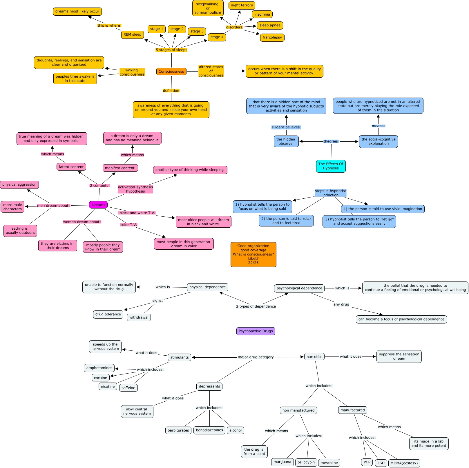 This Concept Map, created with IHMC CmapTools, has information related to: Brooke Chandler ch4 22, stimulants which includes: caffeine, stage 4 disorders sleep apnea, Dreams activation-synthesis hypothesis another type of thinking while sleeping, manufactured which includes: LSD, depressants which includes: alcohol, manufactured which includes: MDMA(ecstasy), Dreams women dream about: mostly people they know in their dream, Dreams men dream about: setting is usually outdoors, non manufactured which includes: psilocybin, Psychoactive Drugs major drug category narcotics, the social-cognitive explanation means: people who are hypnotized are not in an altered state but are merely playing the role expected of them in the situation, Consciousness definition awareness of everything that is going on around you and inside your own head at any given moments, REM sleep this is where dreams most likely occur, Consciousness waking consciousness peoples time awake is in this state, The Effects Of Hypnosis steps in hypnotist induction 1) hypnotist tells the person to focus on what is being said, Consciousness 5 stages of sleep: stage 1, Dreams 2 contents: manifest content, Consciousness 5 stages of sleep: stage 2, The Effects Of Hypnosis steps in hypnotist induction 4) the person is told to use vivid imagination, The Effects Of Hypnosis theories the hidden observer