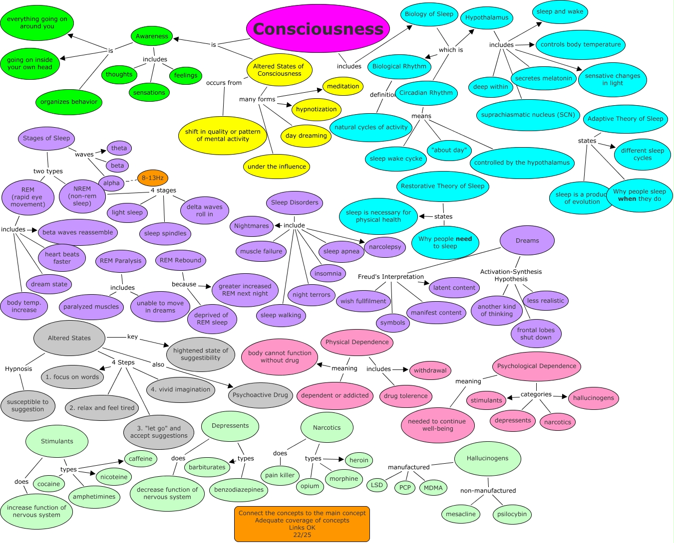 This Concept Map, created with IHMC CmapTools, has information related to: Cori Day Ch 4 22, Altered States of Consciousness many forms hypnotization, REM Paralysis includes unable to move in dreams, Narcotics types opium, Biology of Sleep which is Circadian Rhythm, Biology of Sleep which is Biological Rhythm, Psychological Dependence categories stimulants, Dreams Freud's Interpretation manifest content, Psychological Dependence meaning needed to continue well-being, Awareness is organizes behavior, Altered States 4 Steps 3. "let go" and accept suggestions, Adaptive Theory of Sleep states different sleep cycles, Hypothalamus includes sensative changes in light, alpha . 8-13Hz, Hallucinogens manufactured MDMA, Depressents types benzodiazepines, Sleep Disorders include narcolepsy, Altered States of Consciousness many forms under the influence, NREM (non-rem sleep) 4 stages sleep spindles, Altered States Hypnosis susceptible to suggestion, Awareness is going on inside your own head