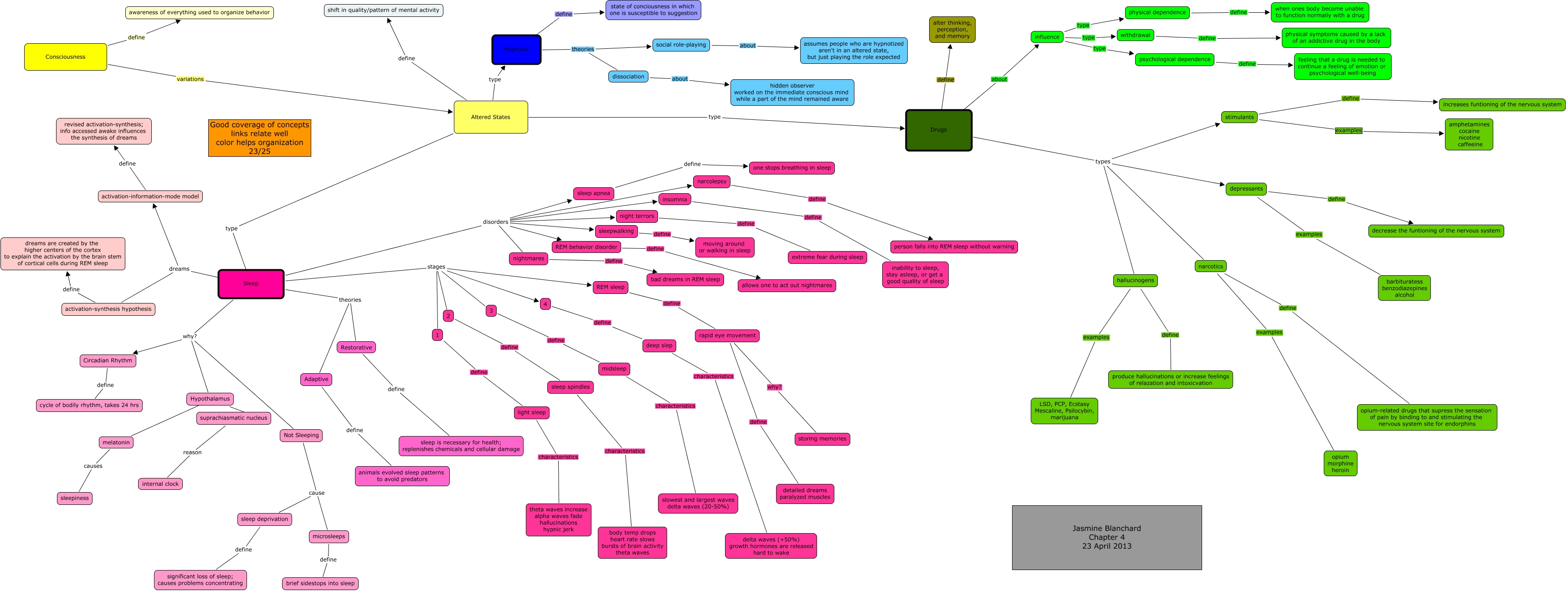 This Concept Map, created with IHMC CmapTools, has information related to: JBlanchard Ch 4 23, Adaptive define animals evolved sleep patterns to avoid predators, stimulants define increases funtioning of the nervous system, Sleep theories Restorative, Hypothalamus suprachiasmatic nucleus, rapid eye movement define detailed dreams paralyzed muscles, sleep deprivation define significant loss of sleep; causes problems concentrating, Hypnosis theories dissociation, narcotics examples opium morphine heroin, Sleep stages 4, 1 define light sleep, melatonin causes sleepiness, social role-playing about assumes people who are hypnotized aren't in an altered state, but just playing the role expected, night terrors define extreme fear during sleep, influence type physical dependence, microsleeps define brief sidestops into sleep, 2 define sleep spindles, Sleep disorders nightmares, Sleep disorders narcolepsy, Sleep disorders sleep apnea, activation-information-mode model define revised activation-synthesis; info accessed awake influences the synthesis of dreams