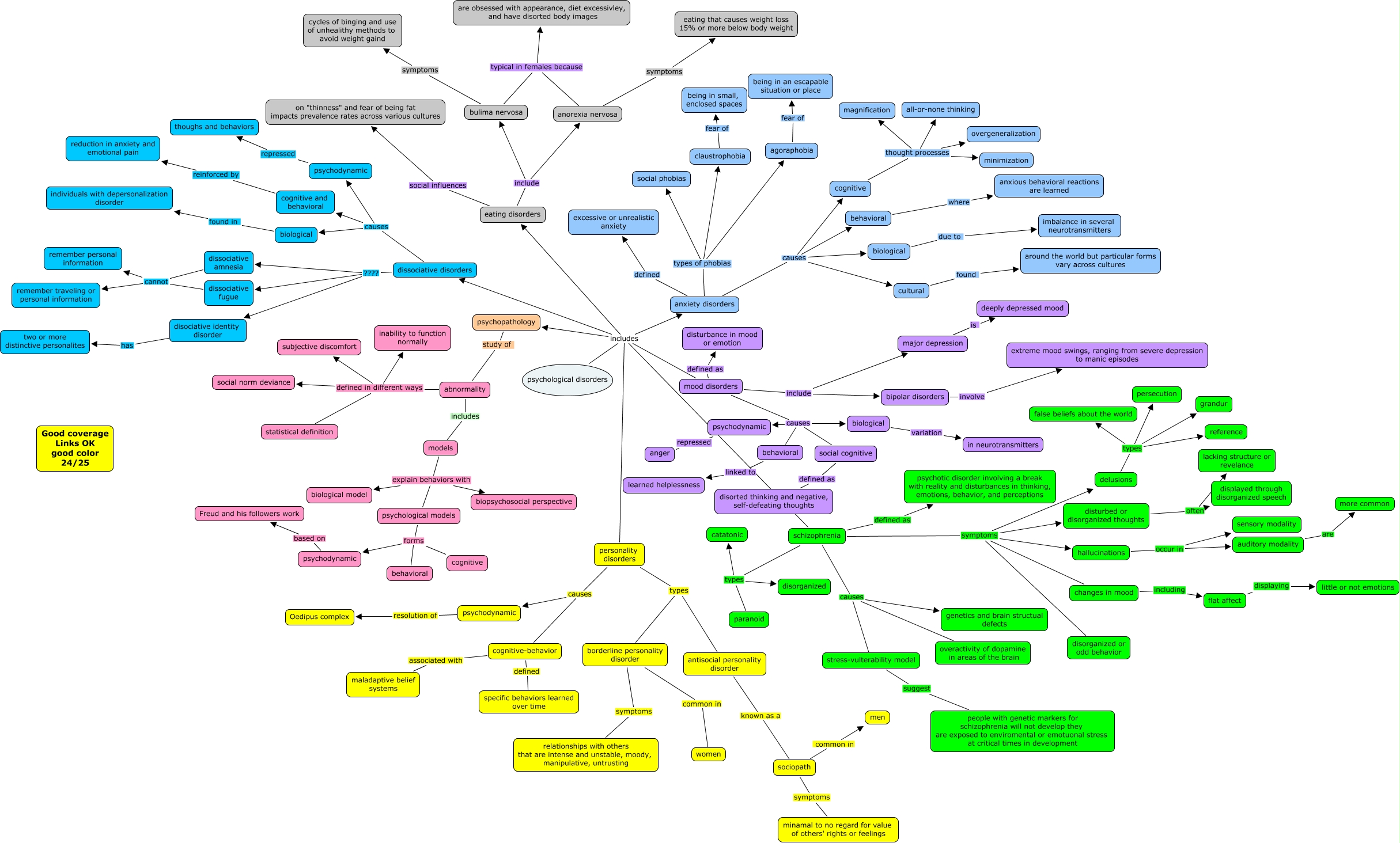 This Concept Map, created with IHMC CmapTools, has information related to: bishop ch. 14 24, anxiety disorders defined excessive or unrealistic anxiety, anxiety disorders causes behavioral, schizophrenia causes overactivity of dopamine in areas of the brain, anorexia nervosa symptoms eating that causes weight loss 15% or more below body weight, anxiety disorders types of phobias claustrophobia, anxiety disorders causes cognitive, cognitive-behavior defined specific behaviors learned over time, schizophrenia types paranoid, schizophrenia causes stress-vulterability model, dissociative amnesia cannot remember personal information, mood disorders include bipolar disorders, delusions types grandur, borderline personality disorder common in women, dissociative fugue cannot remember traveling or personal information, dissociative disorders causes psychodynamic, models explain behaviors with psychological models, psychological disorders includes schizophrenia, personality disorders causes psychodynamic, disturbed or disorganized thoughts often lacking structure or revelance, psychological models forms cognitive