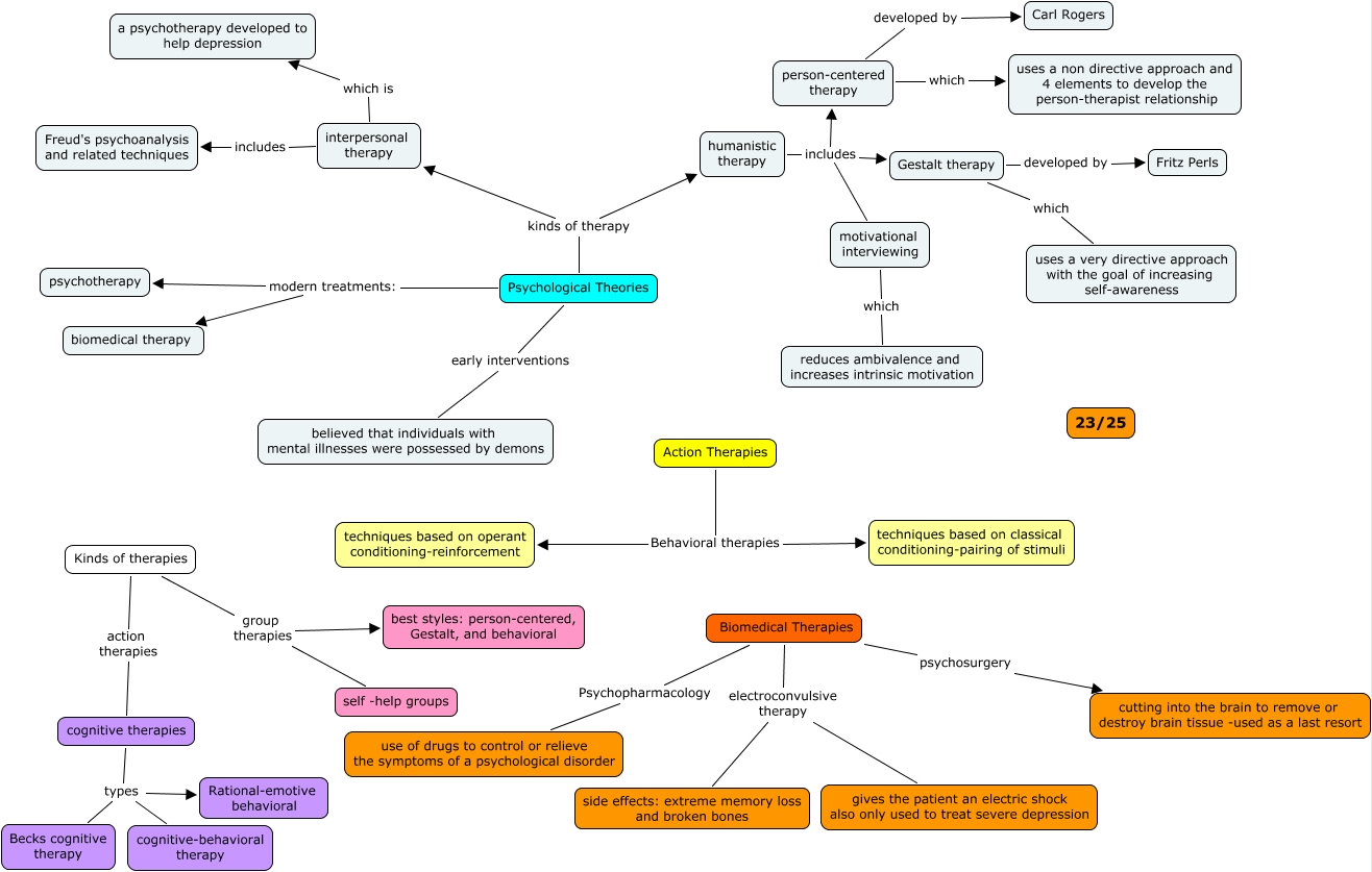 This Concept Map, created with IHMC CmapTools, has information related to: BrookeChandler ch15 23, Action Therapies Behavioral therapies techniques based on classical conditioning-pairing of stimuli, Biomedical Therapies electroconvulsive therapy side effects: extreme memory loss and broken bones, Biomedical Therapies Psychopharmacology use of drugs to control or relieve the symptoms of a psychological disorder, Action Therapies Behavioral therapies techniques based on operant conditioning-reinforcement, Psychological Theories early interventions believed that individuals with mental illnesses were possessed by demons, cognitive therapies types Becks cognitive therapy, Gestalt therapy developed by Fritz Perls, Kinds of therapies action therapies cognitive therapies, Biomedical Therapies psychosurgery cutting into the brain to remove or destroy brain tissue -used as a last resort, Psychological Theories modern treatments: biomedical therapy, Kinds of therapies group therapies self -help groups, interpersonal therapy includes Freud's psychoanalysis and related techniques, person-centered therapy which uses a non directive approach and 4 elements to develop the person-therapist relationship, person-centered therapy developed by Carl Rogers, motivational interviewing which reduces ambivalence and increases intrinsic motivation, Gestalt therapy which uses a very directive approach with the goal of increasing self-awareness, Psychological Theories kinds of therapy humanistic therapy, Kinds of therapies group therapies best styles: person-centered, Gestalt, and behavioral, cognitive therapies types cognitive-behavioral therapy, Biomedical Therapies electroconvulsive therapy gives the patient an electric shock also only used to treat severe depression