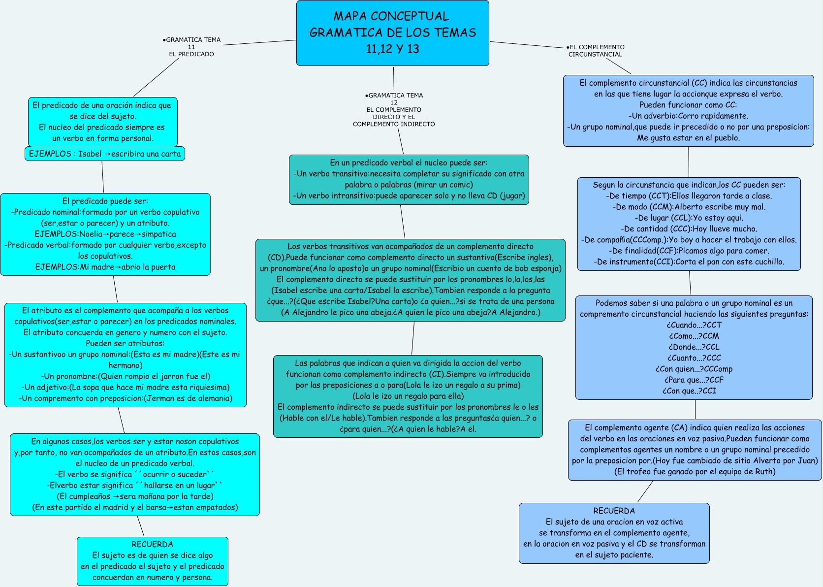 Este Cmap, tiene información relacionada con: MAPA CONCEPTUAL GRAMATICA TEMAS 11,12 Y 13, El complemento circunstancial (CC) indica las circunstancias en las que tiene lugar la accionque expresa el verbo. Pueden funcionar como CC: -Un adverbio:Corro rapidamente. -Un grupo nominal,que puede ir precedido o no por una preposicion: Me gusta estar en el pueblo. ???? Segun la circunstancia que indican,los CC pueden ser: -De tiempo (CCT):Ellos llegaron tarde a clase. -De modo (CCM):Alberto escribe muy mal. -De lugar (CCL):Yo estoy aqui. -De cantidad (CCC):Hoy llueve mucho. -De compañia(CCComp.):Yo boy a hacer el trabajo con ellos. -De finalidad(CCF):Picamos algo para comer. -De instrumento(CCI):Corta el pan con este cuchillo., El atributo es el complemento que acompaña a los verbos copulativos(ser,estar o parecer) en los predicados nominales. El atributo concuerda en genero y numero con el sujeto. Pueden ser atributos: -Un sustantivoo un grupo nominal:(Esta es mi madre)(Este es mi hermano) -Un pronombre:(Quien rompio el jarron fue el) -Un adjetivo:(La sopa que hace mi madre esta riquiesima) -Un compremento con preposicion:(Jerman es de alemania) ???? En algunos casos,los verbos ser y estar noson copulativos y,por tanto, no van acompañados de un atributo.En estos casos,son el nucleo de un predicado verbal. -El verbo se significa ´´ocurrir o suceder`` -Elverbo estar significa ´´hallarse en un lugar`` (El cumpleaños →sera mañana por la tarde) (En este partido el madrid y el barsa→estan empatados), Podemos saber si una palabra o un grupo nominal es un compremento circunstancial haciendo las siguientes preguntas: ¿Cuando...?CCT ¿Como...?CCM ¿Donde...?CCL ¿Cuanto...?CCC ¿Con quien...?CCComp ¿Para que...?CCF ¿Con que..?CCI ???? El complemento agente (CA) indica quien realiza las acciones del verbo en las oraciones en voz pasiva.Pueden funcionar como complementos agentes un nombre o un grupo nominal precedido por la preposicion por.(Hoy fue cambiado de sitio Alverto por Juan) (El trofeo fue ganado por el equipo de Ruth), Los verbos transitivos van acompañados de un complemento directo (CD).Puede funcionar como complemento directo un sustantivo(Escribe ingles), un pronombre(Ana lo aposto)o un grupo nominal(Escribio un cuento de bob esponja) El complemento directo se puede sustituir por los pronombres lo,la,los,las (Isabel escribe una carta/Isabel la escribe).Tambien responde a la pregunta ¿que...?(¿Que escribe Isabel?Una carta)o ¿a quien...?si se trata de una persona (A Alejandro le pico una abeja.¿A quien le pico una abeja?A Alejandro.) ???? Las palabras que indican a quien va dirigida la accion del verbo funcionan como complemento indirecto (CI).Siempre va introducido por las preposiciones a o para(Lola le izo un regalo a su prima) (Lola le izo un regalo para ella) El complemento indirecto se puede sustituir por los pronombres le o les (Hable con el/Le hable).Tambien responde a las preguntas¿a quien...? o ¿para quien...?(¿A quien le hable?A el., El predicado puede ser: -Predicado nominal:formado por un verbo copulativo (ser,estar o parecer) y un atributo. EJEMPLOS:Noelia→parece→simpatica -Predicado verbal:formado por cualquier verbo,excepto los copulativos. EJEMPLOS:Mi madre→abrio la puerta ???? El atributo es el complemento que acompaña a los verbos copulativos(ser,estar o parecer) en los predicados nominales. El atributo concuerda en genero y numero con el sujeto. Pueden ser atributos: -Un sustantivoo un grupo nominal:(Esta es mi madre)(Este es mi hermano) -Un pronombre:(Quien rompio el jarron fue el) -Un adjetivo:(La sopa que hace mi madre esta riquiesima) -Un compremento con preposicion:(Jerman es de alemania), MAPA CONCEPTUAL GRAMATICA DE LOS TEMAS 11,12 Y 13 ∙EL COMPLEMENTO CIRCUNSTANCIAL El complemento circunstancial (CC) indica las circunstancias en las que tiene lugar la accionque expresa el verbo. Pueden funcionar como CC: -Un adverbio:Corro rapidamente. -Un grupo nominal,que puede ir precedido o no por una preposicion: Me gusta estar en el pueblo., En un predicado verbal el nucleo puede ser: -Un verbo transitivo:necesita completar su significado con otra palabra o palabras (mirar un comic) -Un verbo intransitivo:puede aparecer solo y no lleva CD (jugar) ???? Los verbos transitivos van acompañados de un complemento directo (CD).Puede funcionar como complemento directo un sustantivo(Escribe ingles), un pronombre(Ana lo aposto)o un grupo nominal(Escribio un cuento de bob esponja) El complemento directo se puede sustituir por los pronombres lo,la,los,las (Isabel escribe una carta/Isabel la escribe).Tambien responde a la pregunta ¿que...?(¿Que escribe Isabel?Una carta)o ¿a quien...?si se trata de una persona (A Alejandro le pico una abeja.¿A quien le pico una abeja?A Alejandro.), MAPA CONCEPTUAL GRAMATICA DE LOS TEMAS 11,12 Y 13 ∙GRAMATICA TEMA 12 EL COMPLEMENTO DIRECTO Y EL COMPLEMENTO INDIRECTO En un predicado verbal el nucleo puede ser: -Un verbo transitivo:necesita completar su significado con otra palabra o palabras (mirar un comic) -Un verbo intransitivo:puede aparecer solo y no lleva CD (jugar), Segun la circunstancia que indican,los CC pueden ser: -De tiempo (CCT):Ellos llegaron tarde a clase. -De modo (CCM):Alberto escribe muy mal. -De lugar (CCL):Yo estoy aqui. -De cantidad (CCC):Hoy llueve mucho. -De compañia(CCComp.):Yo boy a hacer el trabajo con ellos. -De finalidad(CCF):Picamos algo para comer. -De instrumento(CCI):Corta el pan con este cuchillo. ???? Podemos saber si una palabra o un grupo nominal es un compremento circunstancial haciendo las siguientes preguntas: ¿Cuando...?CCT ¿Como...?CCM ¿Donde...?CCL ¿Cuanto...?CCC ¿Con quien...?CCComp ¿Para que...?CCF ¿Con que..?CCI, EJEMPLOS : Isabel →escribira una carta ???? El predicado puede ser: -Predicado nominal:formado por un verbo copulativo (ser,estar o parecer) y un atributo. EJEMPLOS:Noelia→parece→simpatica -Predicado verbal:formado por cualquier verbo,excepto los copulat
