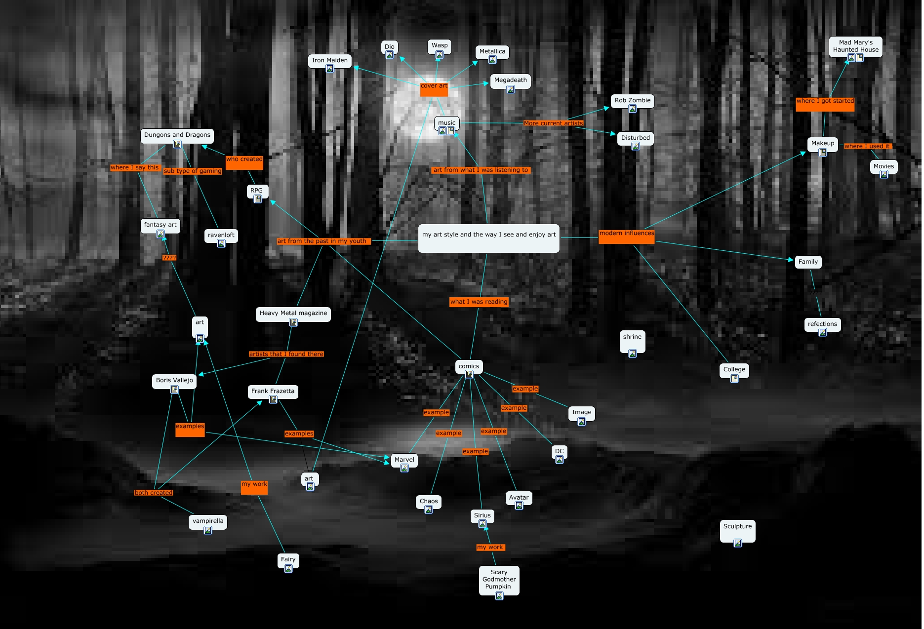 This Concept Map, created with IHMC CmapTools, has information related to: Tony Redmonds art lineage, Boris Vallejo examples Marvel, art ???? fantasy art, music cover art Megadeath, Family ???? refections, Frank Frazetta examples Marvel, comics example Marvel, music cover art Dio, my art style and the way I see and enjoy art modern influences College, music cover art art, Scary Godmother Pumpkin my work Sirius, Fairy my work art, music cover art Iron Maiden, RPG who created Dungons and Dragons, my art style and the way I see and enjoy art art from the past in my youth RPG, my art style and the way I see and enjoy art art from the past in my youth Heavy Metal magazine, my art style and the way I see and enjoy art what I was reading comics, comics example DC, Dungons and Dragons where I say this fantasy art, Boris Vallejo examples art, Makeup where I got started Mad Mary's Haunted House