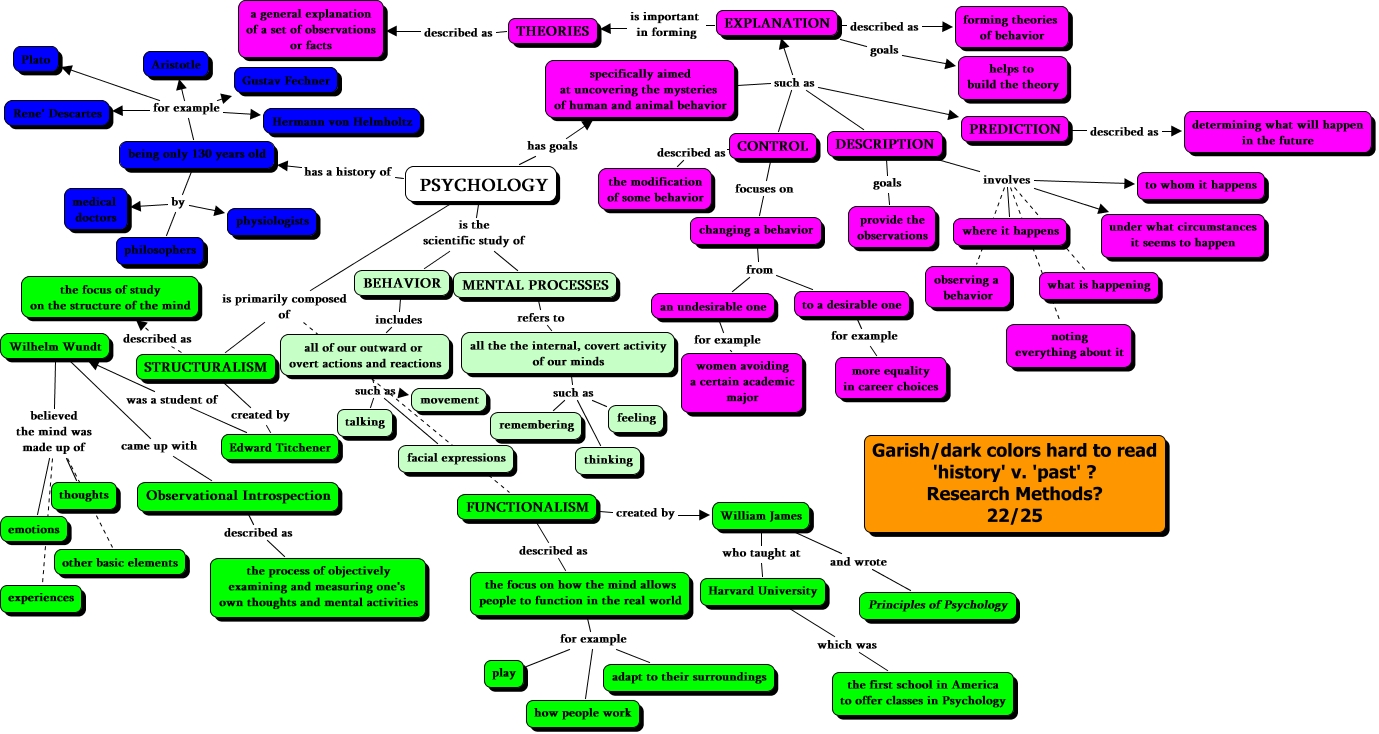 This Concept Map, created with IHMC CmapTools, has information related to: Johnson J. Ch.1 22, all of our outward or overt actions and reactions such as talking, DESCRIPTION involves observing a behavior, the focus on how the mind allows people to function in the real world for example adapt to their surroundings, being only 130 years old by physiologists, Wilhelm Wundt believed the mind was made up of other basic elements, DESCRIPTION involves to whom it happens, changing a behavior from an undesirable one, specifically aimed at uncovering the mysteries of human and animal behavior such as EXPLANATION, Wilhelm Wundt believed the mind was made up of emotions, Wilhelm Wundt believed the mind was made up of thoughts, Harvard University which was the first school in America to offer classes in Psychology, DESCRIPTION involves where it happens, EXPLANATION described as forming theories of behavior, being only 130 years old by philosophers, EXPLANATION is important in forming THEORIES, to a desirable one for example more equality in career choices, being only 130 years old for example Rene' Descartes, FUNCTIONALISM described as the focus on how the mind allows people to function in the real world, EXPLANATION goals helps to build the theory, THEORIES described as a general explanation of a set of observations or facts
