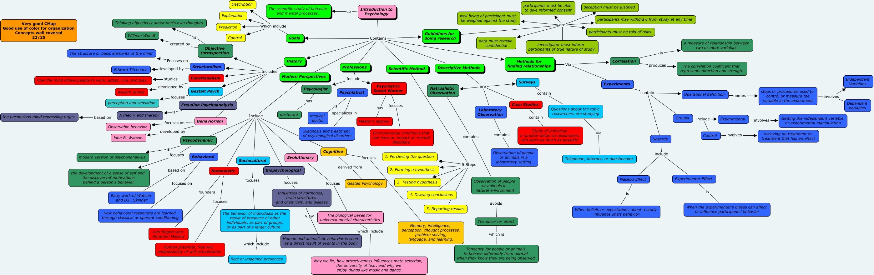 This Concept Map, created with IHMC CmapTools, has information related to: Heffron, Mackenzie Ch 1 23, Descriptive Methods are Surveys, Behaviorism developed by John B. Watson, A theory and therapy based on the unconcious mind repressing urges, Psychiatric Social Worker has Master's degree, Objective Introspection is Thinking objectively about one's own thoughts, Goals Which include Explanation, Scientific Method 5 Steps 3. Testing hypothesis, Scientific Method 5 Steps 4. Drawing conclusions, Introduction to Psychology Contains Scientific Method, Introduction to Psychology Contains Descriptive Methods, Psychiatrist specializes in Diagnosis and treatment of psychological disorders, Control involves recieving no treatment or treatment that has an effect, Laboratory Observation contains Observation of people or animals in a laborartory setting, Psychiatrist is medical doctor, Structuralism developed by Edward Titchener, Humanistic founders Carl Rogers and Abraham Maslow, Experiments contain Operational definition, Introduction to Psychology IS The scientific study of behavior and mental processes., Scientific Method 5 Steps 1. Percieving the question, Groups include Experimental