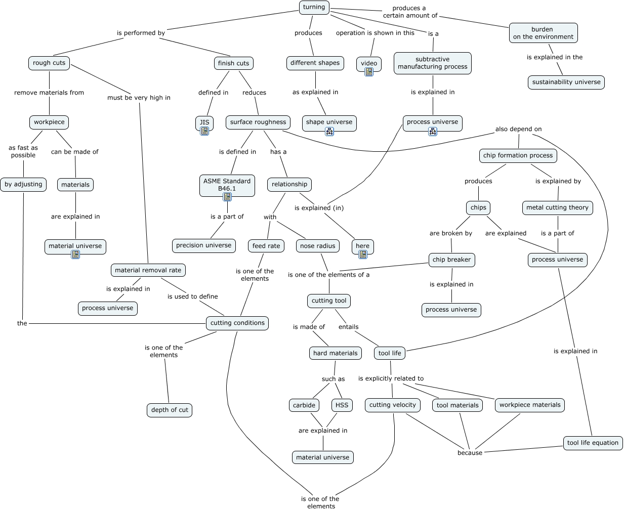 This Concept Map, created with IHMC CmapTools, has information related to: finish cut of turning, cutting velocity is one of the elements cutting conditions, hard materials such as carbide, chips are broken by chip breaker, materials are explained in material universe, turning produces different shapes, different shapes as explained in shape universe, cutting conditions is one of the elements depth of cut, turning operation is shown in this video, workpiece can be made of materials, HSS are explained in material universe, nose radius is one of the elements of a cutting tool, tool life is explicitly related to cutting velocity, burden on the environment is explained in the sustainability universe, chips are explained process universe, relationship with feed rate, subtractive manufacturing process is explained in process universe, turning produces a certain amount of burden on the environment, cutting conditions is used to define material removal rate, material removal rate is explained in process universe, finish cuts reduces surface roughness