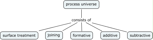 This Concept Map, created with IHMC CmapTools, has information related to: process universe, process universe consists of joining, process universe consists of formative, process universe consists of surface treatment, process universe consists of additive, process universe consists of subtractive