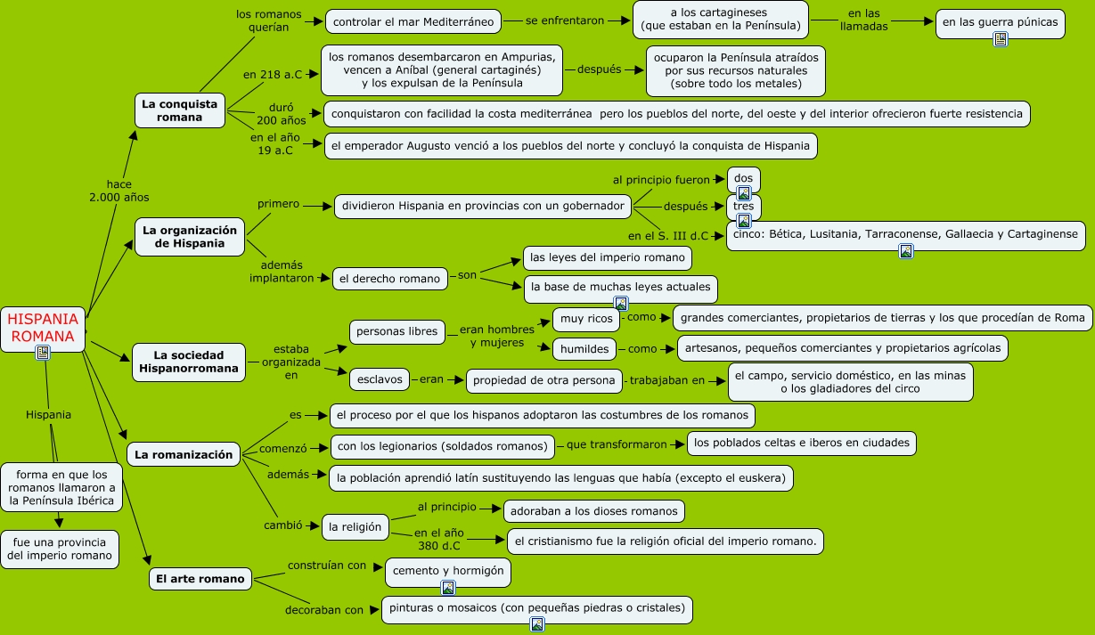Este Cmap, tiene información relacionada con: Hispania romana, propiedad de otra persona trabajaban en el campo, servicio doméstico, en las minas o los gladiadores del circo, el derecho romano son las leyes del imperio romano, HISPANIA ROMANA Hispania fue una provincia del imperio romano, controlar el mar Mediterráneo se enfrentaron a los cartagineses (que estaban en la Península), La organización de Hispania primero dividieron Hispania en provincias con un gobernador, HISPANIA ROMANA ???? La organización de Hispania, muy ricos como grandes comerciantes, propietarios de tierras y los que procedían de Roma, La romanización es el proceso por el que los hispanos adoptaron las costumbres de los romanos, esclavos eran propiedad de otra persona, La romanización comenzó con los legionarios (soldados romanos), La organización de Hispania además implantaron el derecho romano, El arte romano construían con cemento y hormigón, La conquista romana duró 200 años conquistaron con facilidad la costa mediterránea pero los pueblos del norte, del oeste y del interior ofrecieron fuerte resistencia, El arte romano decoraban con pinturas o mosaicos (con pequeñas piedras o cristales), el derecho romano son la base de muchas leyes actuales, la religión en el año 380 d.C el cristianismo fue la religión oficial del imperio romano., HISPANIA ROMANA ???? La sociedad Hispanorromana, La romanización cambió la religión, dividieron Hispania en provincias con un gobernador en el S. III d.C cinco: Bética, Lusitania, Tarraconense, Gallaecia y Cartaginense, los romanos desembarcaron en Ampurias, vencen a Aníbal (general cartaginés) y los expulsan de la Península después ocuparon la Península atraídos por sus recursos naturales (sobre todo los metales)