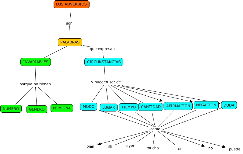 Este Cmap, tiene información relacionada con: LOS ADVERBIOS(Nacho), CIRCUNSTANCIAS y pueden ser de AFIRMACION, CIRCUNSTANCIAS y pueden ser de CANTIDAD, CIRCUNSTANCIAS y pueden ser de DUDA, DUDA como bien, CIRCUNSTANCIAS y pueden ser de LUGAR, AFIRMACION como bien, LUGAR como puede, AFIRMACION como puede, CIRCUNSTANCIAS y pueden ser de NEGACION, AFIRMACION como ayer, INVARIABLES porque no tienen PERSONA, INVARIABLES porque no tienen NUMERO, NEGACION como si, MODO como bien, TIEMPO como no, AFIRMACION como alli, DUDA como ayer, TIEMPO como si, MODO como puede, DUDA como mucho