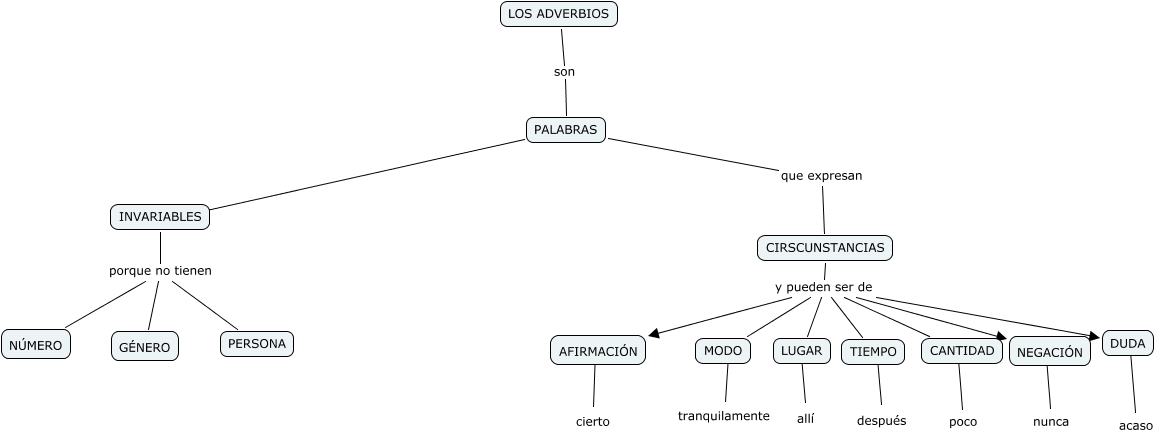 Este Cmap, tiene información relacionada con: LOS ABVERBIOS(Carlos), CIRSCUNSTANCIAS y pueden ser de AFIRMACIÓN, INVARIABLES porque no tienen PERSONA, LOS ADVERBIOS son PALABRAS, INVARIABLES porque no tienen NÚMERO, LUGAR ???? allí, PALABRAS ???? INVARIABLES, MODO ???? tranquilamente, AFIRMACIÓN ???? cierto, CIRSCUNSTANCIAS y pueden ser de TIEMPO, CIRSCUNSTANCIAS y pueden ser de DUDA, CANTIDAD ???? poco, DUDA ???? acaso, CIRSCUNSTANCIAS y pueden ser de LUGAR, PALABRAS que expresan CIRSCUNSTANCIAS, NEGACIÓN ???? nunca, CIRSCUNSTANCIAS y pueden ser de NEGACIÓN, INVARIABLES porque no tienen GÉNERO, CIRSCUNSTANCIAS y pueden ser de CANTIDAD, CIRSCUNSTANCIAS y pueden ser de MODO, TIEMPO ???? después