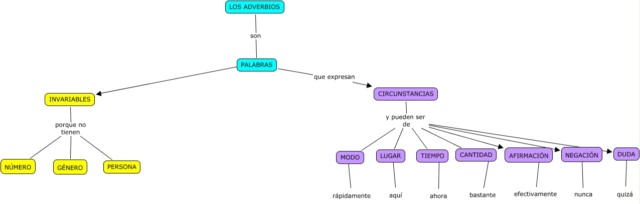 Este Cmap, tiene información relacionada con: LOS ADVERBIOS(Noa), CIRCUNSTANCIAS y pueden ser de TIEMPO, CIRCUNSTANCIAS y pueden ser de MODO, CIRCUNSTANCIAS y pueden ser de LUGAR, PALABRAS que expresan CIRCUNSTANCIAS, LOS ADVERBIOS son PALABRAS, INVARIABLES porque no tienen NÚMERO, INVARIABLES porque no tienen PERSONA, PALABRAS ???? INVARIABLES, MODO ???? rápidamente, DUDA ???? quizá, LUGAR ???? aquí, AFIRMACIÓN ???? efectivamente, INVARIABLES porque no tienen GÉNERO, TIEMPO ???? ahora, CIRCUNSTANCIAS y pueden ser de CANTIDAD, CIRCUNSTANCIAS y pueden ser de AFIRMACIÓN, CANTIDAD ???? bastante, CIRCUNSTANCIAS y pueden ser de DUDA, NEGACIÓN ???? nunca, CIRCUNSTANCIAS y pueden ser de NEGACIÓN