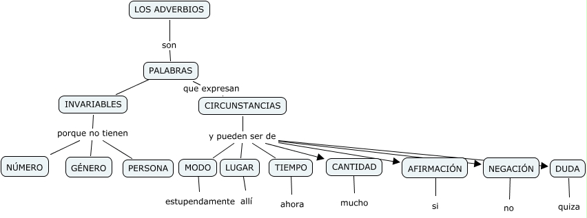 Este Cmap, tiene información relacionada con: LOS ADVERBIOS(Daniel), INVARIABLES porque no tienen GÉNERO, LUGAR ???? allí, CIRCUNSTANCIAS y pueden ser de DUDA, MODO ???? estupendamente, LOS ADVERBIOS son PALABRAS, CANTIDAD ???? mucho, TIEMPO ???? ahora, CIRCUNSTANCIAS y pueden ser de LUGAR, INVARIABLES porque no tienen NÚMERO, NEGACIÓN ???? no, PALABRAS ???? INVARIABLES, AFIRMACIÓN ???? si, CIRCUNSTANCIAS y pueden ser de TIEMPO, CIRCUNSTANCIAS y pueden ser de CANTIDAD, INVARIABLES porque no tienen PERSONA, CIRCUNSTANCIAS y pueden ser de MODO, CIRCUNSTANCIAS y pueden ser de AFIRMACIÓN, DUDA ???? quiza, CIRCUNSTANCIAS y pueden ser de NEGACIÓN, PALABRAS que expresan CIRCUNSTANCIAS