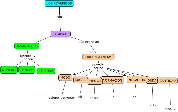 Este Cmap, tiene información relacionada con: LOS ADVERBIOS(Naiara), CIRCUNSTANCIAS y pueden ser de LUGAR, CIRCUNSTANCIAS y pueden ser de DUDA, INVARIABLES porque no tienen PERSONA, CIRCUNSTANCIAS y pueden ser de TIEMPO, NEGACIÓN ???? no, DUDA ???? creo, CIRCUNSTANCIAS y pueden ser de AFIRMACIÓN, CIRCUNSTANCIAS y pueden ser de CANTIDAD, INVARIABLES porque no tienen GÉNERO, PALABRAS que expresan CIRCUNSTANCIAS, TIEMPO ???? ahora, CANTIDAD ???? mucho, MODO ???? estupendamente, PALABRAS ???? INVARIABLES, INVARIABLES porque no tienen NÚMERO, CIRCUNSTANCIAS y pueden ser de MODO, AFIRMACIÓN ???? si, CIRCUNSTANCIAS y pueden ser de NEGACIÓN, LOS ADVERBIOS son PALABRAS, LUGAR ???? alli