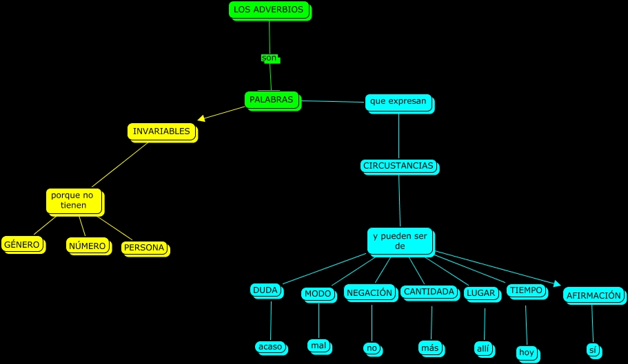 Este Cmap, tiene información relacionada con: LOS ADVERBIOS(Francisco), LOS ADVERBIOS son PALABRAS, INVARIABLES porque no tienen NÚMERO, AFIRMACIÓN ???? sí, TIEMPO ???? hoy, CIRCUSTANCIAS y pueden ser de LUGAR, LUGAR ???? allí, INVARIABLES porque no tienen GÉNERO, NEGACIÓN ???? no, CIRCUSTANCIAS y pueden ser de TIEMPO, PALABRAS ???? INVARIABLES, PALABRAS que expresan CIRCUSTANCIAS, INVARIABLES porque no tienen PERSONA, MODO ???? mal, CANTIDADA ???? más, CIRCUSTANCIAS y pueden ser de NEGACIÓN, CIRCUSTANCIAS y pueden ser de AFIRMACIÓN, DUDA ???? acaso, CIRCUSTANCIAS y pueden ser de CANTIDADA, CIRCUSTANCIAS y pueden ser de DUDA, CIRCUSTANCIAS y pueden ser de MODO
