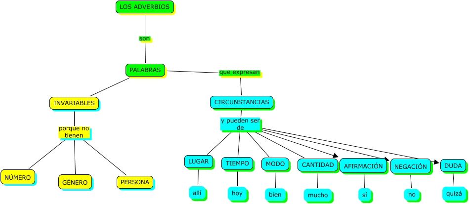 Este Cmap, tiene información relacionada con: LOS ADVERBIOS(Héctor), CANTIDAD ???? mucho, INVARIABLES porque no tienen PERSONA, CIRCUNSTANCIAS y pueden ser de CANTIDAD, CIRCUNSTANCIAS y pueden ser de TIEMPO, CIRCUNSTANCIAS y pueden ser de NEGACIÓN, LOS ADVERBIOS son PALABRAS, NEGACIÓN ???? no, INVARIABLES porque no tienen NÚMERO, PALABRAS que expresan CIRCUNSTANCIAS, MODO ???? bien, CIRCUNSTANCIAS y pueden ser de MODO, CIRCUNSTANCIAS y pueden ser de AFIRMACIÓN, LUGAR ???? allí, INVARIABLES porque no tienen GÉNERO, PALABRAS ???? INVARIABLES, DUDA ???? quizá, TIEMPO ???? hoy, CIRCUNSTANCIAS y pueden ser de DUDA, CIRCUNSTANCIAS y pueden ser de LUGAR, AFIRMACIÓN ???? sí