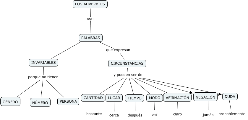 Este Cmap, tiene información relacionada con: LOS ADVERBIOS(Lucía Re), CIRCUNSTANCIAS y pueden ser de LUGAR, MODO ???? así, LUGAR ???? cerca, DUDA ???? probablemente, CIRCUNSTANCIAS y pueden ser de MODO, CIRCUNSTANCIAS y pueden ser de DUDA, PALABRAS ???? INVARIABLES, CIRCUNSTANCIAS y pueden ser de CANTIDAD, LOS ADVERBIOS son PALABRAS, INVARIABLES porque no tienen PERSONA, CIRCUNSTANCIAS y pueden ser de NEGACIÓN, NEGACIÓN ???? jamás, TIEMPO ???? después, PALABRAS que expresan CIRCUNSTANCIAS, INVARIABLES porque no tienen NÚMERO, CIRCUNSTANCIAS y pueden ser de AFIRMACIÓN, AFIRMACIÓN ???? claro, INVARIABLES porque no tienen GÉNERO, CANTIDAD ???? bastante, CIRCUNSTANCIAS y pueden ser de TIEMPO