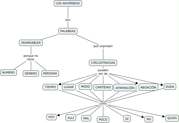 Este Cmap, tiene información relacionada con: LOS ADVERBIOS_Esther, CIRCUSTRACIAS pueden ser de DUDA, CANTIDAD como POCO, NEGACIÓN como SÍ, NEGACIÓN como POCO, NEGACIÓN como QUIZA, CANTIDAD como HOY, AFIRMACIÓN como NO, CIRCUSTRACIAS pueden ser de LUGAR, TIEMPO como ALLÍ, CANTIDAD como ALLÍ, TIEMPO como POCO, MODO como SÍ, INVARIABLES porque no tiene NUMERO, TIEMPO como HOY, MODO como MAL, DUDA como SÍ, INVARIABLES porque no tiene GENERO, MODO como HOY, CANTIDAD como MAL, CIRCUSTRACIAS pueden ser de CANTIDAD