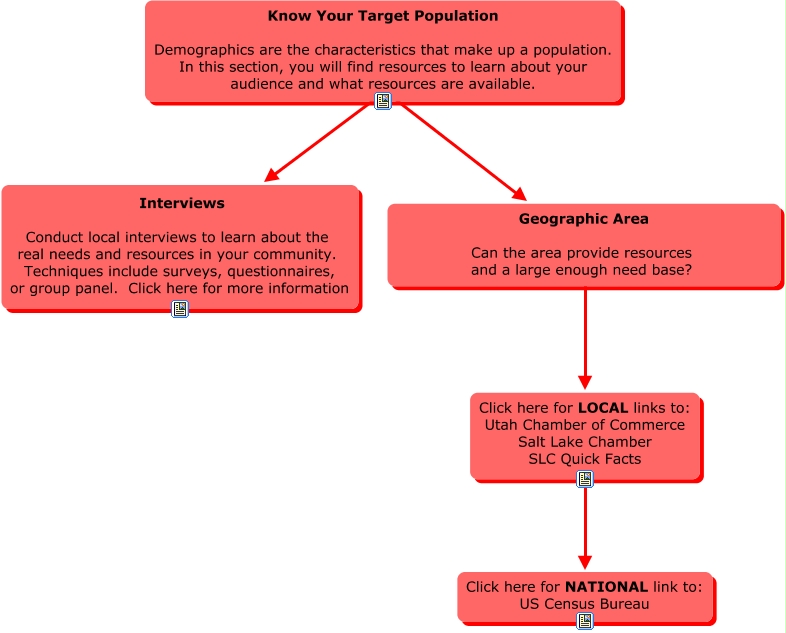 This Concept Map, created with IHMC CmapTools, has information related to: NA Submap Step 2 (Demographics) - Final, Click here for LOCAL links to: Utah Chamber of Commerce Salt Lake Chamber SLC Quick Facts ???? Click here for NATIONAL link to: US Census Bureau, Know Your Target Population Demographics are the characteristics that make up a population. In this section, you will find resources to learn about your audience and what resources are available. ???? Geographic Area Can the area provide resources and a large enough need base?, Know Your Target Population Demographics are the characteristics that make up a population. In this section, you will find resources to learn about your audience and what resources are available. ???? Interviews Conduct local interviews to learn about the real needs and resources in your community. Techniques include surveys, questionnaires, or group panel. Click here for more information, Geographic Area Can the area provide resources and a large enough need base? Local Click here for LOCAL links to: Utah Chamber of Commerce Salt Lake Chamber SLC Quick Facts