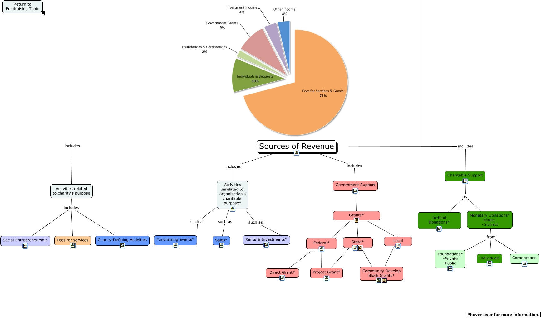 This Concept Map, created with IHMC CmapTools, has information related to: Sources of Revenue MINOR, Sources of Revenue includes Charitable Support, Sources of Revenue includes Activities related to charity's purpose, Project Grant* ???? State*, Grants* ???? State*, Federal* ???? Direct Grant*, Sources of Revenue includes Government Support, Grants* ???? Federal*, Government Support ???? Grants*, Community Develop Block Grants* ???? Local, Charitable Support is Monetary Donations* -Direct -Indirect, Grants* ???? Local, Monetary Donations* -Direct -Indirect from Individuals, Monetary Donations* -Direct -Indirect from Foundations* -Private -Public, State* ???? Community Develop Block Grants*, Federal* ???? Project Grant*, Monetary Donations* -Direct -Indirect from Corporations, Activities related to charity's purpose includes Fees for services, Activities related to charity's purpose includes Social Entrepreneurship, Activities unrelated to organization's charitable purpose* such as Fundraising events*, Activities related to charity's purpose includes Charity-Defining Activities