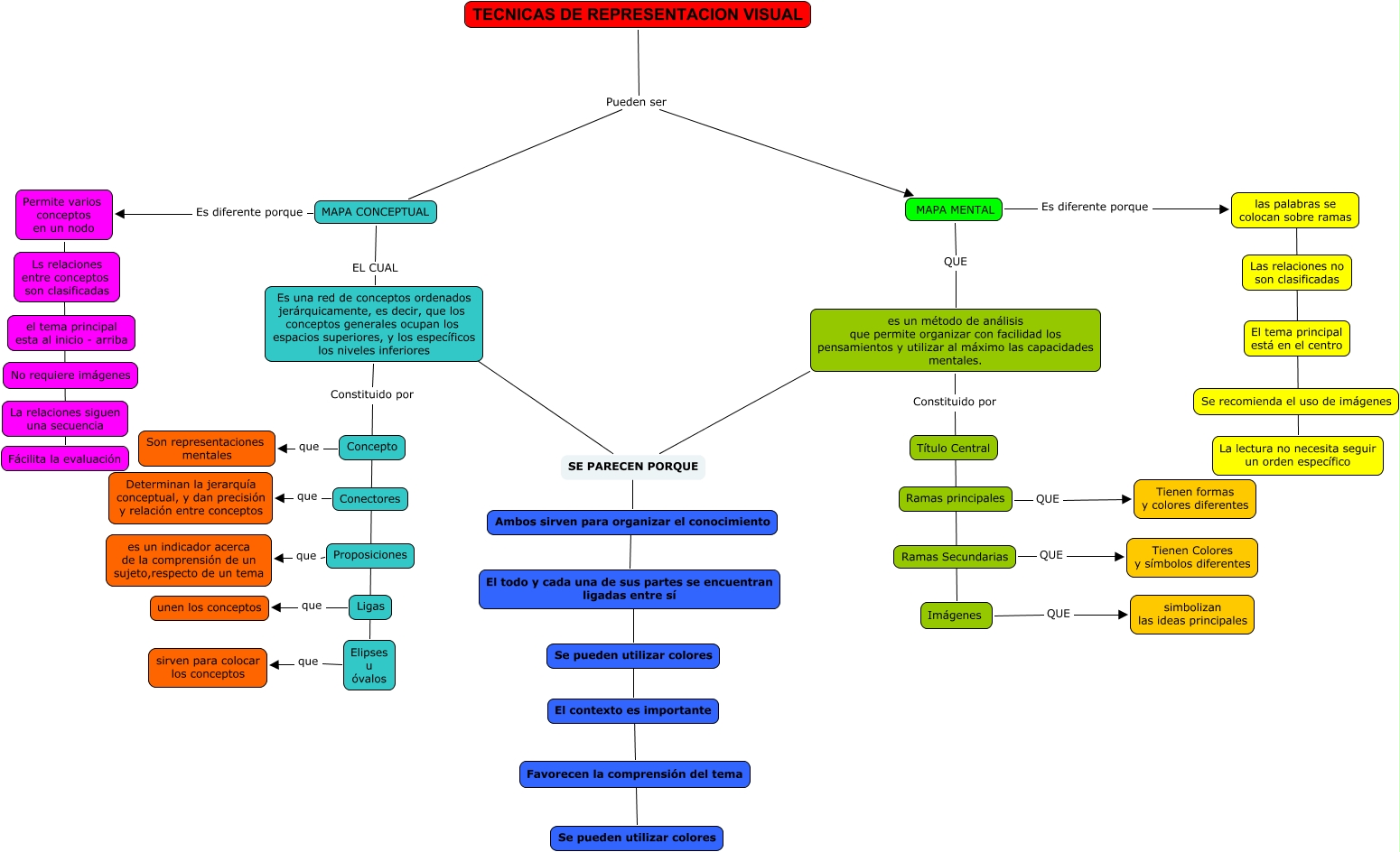 Este Cmap, tiene información relacionada con: diferencias mapa mental y conceptual, Imágenes QUE simbolizan las ideas principales, El contexto es importante ???? Favorecen la comprensión del tema, MAPA CONCEPTUAL Es diferente porque Permite varios conceptos en un nodo, Ramas Secundarias QUE Tienen Colores y símbolos diferentes, Conectores que Determinan la jerarquía conceptual, y dan precisión y relación entre conceptos, Ambos sirven para organizar el conocimiento ???? El todo y cada una de sus partes se encuentran ligadas entre sí, MAPA CONCEPTUAL EL CUAL Es una red de conceptos ordenados jerárquicamente, es decir, que los conceptos generales ocupan los espacios superiores, y los específicos los niveles inferiores, Proposiciones que es un indicador acerca de la comprensión de un sujeto,respecto de un tema, SE PARECEN PORQUE ???? Ambos sirven para organizar el conocimiento, Elipses u óvalos que sirven para colocar los conceptos, Permite varios conceptos en un nodo ???? Fácilita la evaluación, Ramas principales QUE Tienen formas y colores diferentes, SE PARECEN PORQUE ???? Ambos sirven para organizar el conocimiento, Concepto que Son representaciones mentales, Es una red de conceptos ordenados jerárquicamente, es decir, que los conceptos generales ocupan los espacios superiores, y los específicos los niveles inferiores Constituido por Elipses u óvalos, TECNICAS DE REPRESENTACION VISUAL Pueden ser MAPA MENTAL, El todo y cada una de sus partes se encuentran ligadas entre sí ???? Se pueden utilizar colores, MAPA MENTAL Es diferente porque las palabras se colocan sobre ramas, MAPA MENTAL QUE es un método de análisis que permite organizar con facilidad los pensamientos y utilizar al máximo las capacidades mentales., Se pueden utilizar colores ???? El contexto es importante