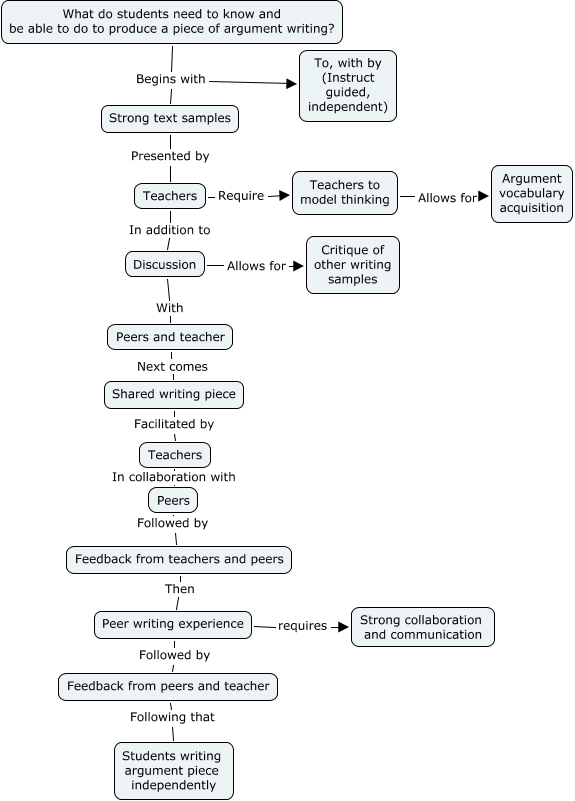 This Concept Map, created with IHMC CmapTools, has information related to: Argument Chain, Shared writing piece Facilitated by Teachers, Feedback from peers and teacher Following that Students writing argument piece independently, Teachers to model thinking Allows for Argument vocabulary acquisition, What do students need to know and be able to do to produce a piece of argument writing? Begins with Strong text samples, Peers Followed by Feedback from teachers and peers, What do students need to know and be able to do to produce a piece of argument writing? Begins with To, with by (Instruct guided, independent), Peer writing experience requires Strong collaboration and communication, Feedback from teachers and peers Then Peer writing experience, Discussion With Peers and teacher, Discussion Allows for Critique of other writing samples, Peers and teacher Next comes Shared writing piece, Peer writing experience Followed by Feedback from peers and teacher, Strong text samples Presented by Teachers, Teachers In collaboration with Peers, Teachers Require Teachers to model thinking, Teachers In addition to Discussion