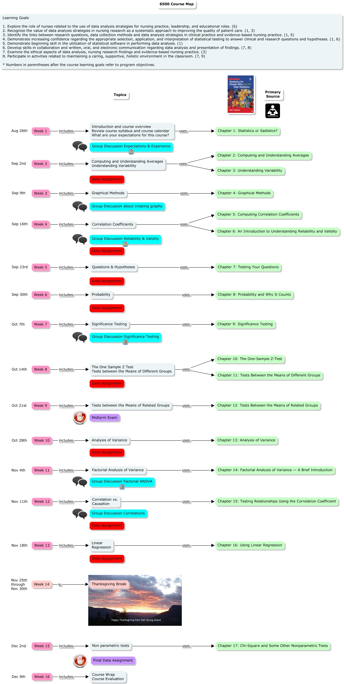 This Concept Map, created with IHMC CmapTools, has information related to: 6500 Course Map, Week 11 includes Factorial Analysis of Variance, Probability uses Chapter 8: Probability and Why It Counts, Week 2 includes Computing and Understanding Averages Understanding Variability, Introduction and course overview Review course syllabus and course calendar What are your expectations for this course? uses Chapter 1: Statistics or Sadistics?, Week 14 is Thanksgiving Break, Questions & Hypotheses uses Chapter 7: Testing Your Questions, Week 13 includes Linear Regression, Computing and Understanding Averages Understanding Variability uses Chapter 3: Understanding Variability, Correlation vs. Causation uses Chapter 15: Testing Relationships Using the Correlation Coefficient, Correlation Coefficients uses Chapter 5: Computing Correlation Coefficients, Week 15 includes Non parametric tests, Week 1 includes Introduction and course overview Review course syllabus and course calendar What are your expectations for this course?, The One Sample Z Test Tests between the Means of Different Groups uses Chapter 10: The One-Sample Z-Test, Week 10 includes Analysis of Variance, Factorial Analysis of Variance uses Chapter 14: Factorial Analysis of Variance — A Brief Introduction, Linear Regression uses Chapter 16: Using Linear Regression, Week 9 includes Tests between the Means of Related Groups, Week 4 includes Correlation Coefficients, Correlation Coefficients uses Chapter 6: An Introduction to Understanding Reliability and Validity, Week 6 includes Probability