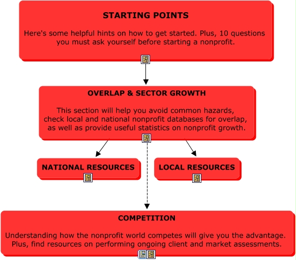 This Concept Map, created with IHMC CmapTools, has information related to: Needs Assessment Step 1 SubMap - Final, STARTING POINTS Here's some helpful hints on how to get started. Plus, 10 questions you must ask yourself before starting a nonprofit. ???? OVERLAP & SECTOR GROWTH This section will help you avoid common hazards, check local and national nonprofit databases for overlap, as well as provide useful statistics on nonprofit growth., OVERLAP & SECTOR GROWTH This section will help you avoid common hazards, check local and national nonprofit databases for overlap, as well as provide useful statistics on nonprofit growth. ???? NATIONAL RESOURCES, OVERLAP & SECTOR GROWTH This section will help you avoid common hazards, check local and national nonprofit databases for overlap, as well as provide useful statistics on nonprofit growth. ???? LOCAL RESOURCES, OVERLAP & SECTOR GROWTH This section will help you avoid common hazards, check local and national nonprofit databases for overlap, as well as provide useful statistics on nonprofit growth. ???? COMPETITION Understanding how the nonprofit world competes will give you the advantage. Plus, find resources on performing ongoing client and market assessments.