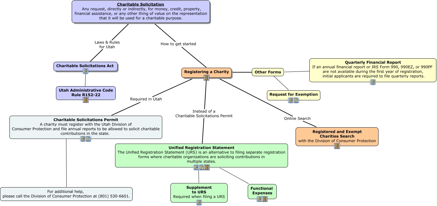 This Concept Map, created with IHMC CmapTools, has information related to: MINOR CMAP_Charitable Solicitation, Registering a Charity Online Search Registered and Exempt Charities Search with the Division of Consumer Protection, Registering a Charity Instead of a Charitable Solicitations Permit Unified Registration Statement The Unified Registration Statement (URS) is an alternative to filing separate registration forms where charitable organizations are soliciting contributions in multiple states., Unified Registration Statement The Unified Registration Statement (URS) is an alternative to filing separate registration forms where charitable organizations are soliciting contributions in multiple states. ???? Functional Expenses, Other Forms ???? Quarterly Financial Report If an annual financial report or IRS Form 990, 990EZ, or 990PF are not available during the first year of registration, initial applicants are required to file quarterly reports., Charitable Solicitations Permit A charity must register with the Utah Division of Consumer Protection and file annual reports to be allowed to solicit charitable contributions in the state. ???? For additional help, please call the Division of Consumer Protection at (801) 530-6601., Charitable Solicitation Any request, directly or indirectly, for money, credit, property, financial assistance, or any other thing of value on the representation that it will be used for a charitable purpose. Laws & Rules for Utah Charitable Solicitations Act, Unified Registration Statement The Unified Registration Statement (URS) is an alternative to filing separate registration forms where charitable organizations are soliciting contributions in multiple states. ???? Supplement to URS Required when filing a URS, Charitable Solicitations Act ???? Utah Administrative Code Rule R152-22, Charitable Solicitation Any request, directly or indirectly, for money, credit, property, financial assistance, or any other thing of value on the representation that it will be used for a charitable purpose. How to get started Registering a Charity, Registering a Charity ???? Other Forms, Registering a Charity Required in Utah Charitable Solicitations Permit A charity must register with the Utah Division of Consumer Protection and file annual reports to be allowed to solicit charitable contributions in the state., Other Forms ???? Request for Exemption