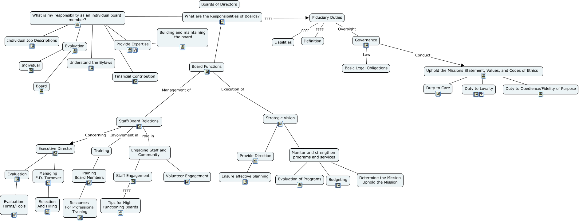 This Concept Map, created with IHMC CmapTools, has information related to: Board of Directors, Engaging Staff and Community ???? Staff Engagement, What is my responsibility as an individual board member? ???? Financial Contribution, Executive Director ???? Managing E.D. Turnover, Monitor and strengthen programs and services ???? Budgeting, Board Functions Execution of Strategic Vision, What is my responsibility as an individual board member? ???? Understand the Bylaws, Managing E.D. Turnover ???? Selection And Hiring, Monitor and strengthen programs and services ???? Evaluation of Programs, What are the Responsibilities of Boards? ???? Board Functions, Uphold the Missions Statement, Values, and Codes of Ethics ???? Duty to Loyalty, Strategic Vision ???? Monitor and strengthen programs and services, Provide Direction ???? Ensure effective planning, Staff Engagement ???? Tips for High Functioning Boards, Engaging Staff and Community ???? Volunteer Engagement, What is my responsibility as an individual board member? ???? Provide Expertise, What are the Responsibilities of Boards? ???? Fiduciary Duties, Training Board Members ???? Resources For Professional Training, Fiduciary Duties ???? Definition, Provide Expertise ???? Building and maintaining the board, Staff/Board Relations role in Engaging Staff and Community