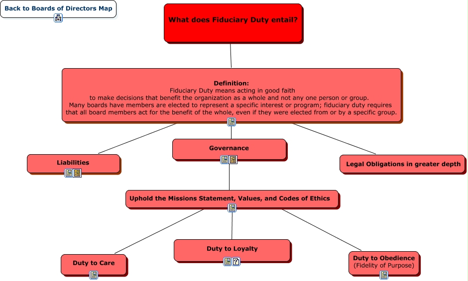This Concept Map, created with IHMC CmapTools, has information related to: Fiduciary Duties, Uphold the Missions Statement, Values, and Codes of Ethics ???? Duty to Loyalty, Definition: Fiduciary Duty means acting in good faith to make decisions that benefit the organization as a whole and not any one person or group. Many boards have members are elected to represent a specific interest or program; fiduciary duty requires that all board members act for the benefit of the whole, even if they were elected from or by a specific group. ???? Liabilities, Definition: Fiduciary Duty means acting in good faith to make decisions that benefit the organization as a whole and not any one person or group. Many boards have members are elected to represent a specific interest or program; fiduciary duty requires that all board members act for the benefit of the whole, even if they were elected from or by a specific group. ???? Legal Obligations in greater depth, Definition: Fiduciary Duty means acting in good faith to make decisions that benefit the organization as a whole and not any one person or group. Many boards have members are elected to represent a specific interest or program; fiduciary duty requires that all board members act for the benefit of the whole, even if they were elected from or by a specific group. ???? Governance, Uphold the Missions Statement, Values, and Codes of Ethics ???? Duty to Care, Governance ???? Uphold the Missions Statement, Values, and Codes of Ethics, Definition: Fiduciary Duty means acting in good faith to make decisions that benefit the organization as a whole and not any one person or group. Many boards have members are elected to represent a specific interest or program; fiduciary duty requires that all board members act for the benefit of the whole, even if they were elected from or by a specific group. ???? What does Fiduciary Duty entail?, Uphold the Missions Statement, Values, and Codes of Ethics ???? Duty to Obedience (Fidelity of Purpose)