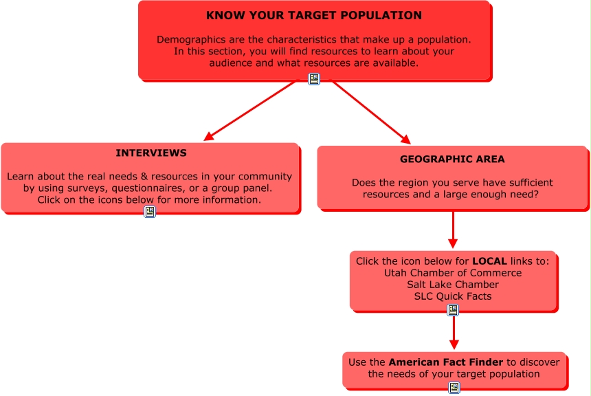 This Concept Map, created with IHMC CmapTools, has information related to: demographics_with links, KNOW YOUR TARGET POPULATION Demographics are the characteristics that make up a population. In this section, you will find resources to learn about your audience and what resources are available. ???? GEOGRAPHIC AREA Does the region you serve have sufficient resources and a large enough need?, Click the icon below for LOCAL links to: Utah Chamber of Commerce Salt Lake Chamber SLC Quick Facts ???? Use the American Fact Finder to discover the needs of your target population, KNOW YOUR TARGET POPULATION Demographics are the characteristics that make up a population. In this section, you will find resources to learn about your audience and what resources are available. ???? INTERVIEWS Learn about the real needs & resources in your community by using surveys, questionnaires, or a group panel. Click on the icons below for more information., GEOGRAPHIC AREA Does the region you serve have sufficient resources and a large enough need? Local Click the icon below for LOCAL links to: Utah Chamber of Commerce Salt Lake Chamber SLC Quick Facts