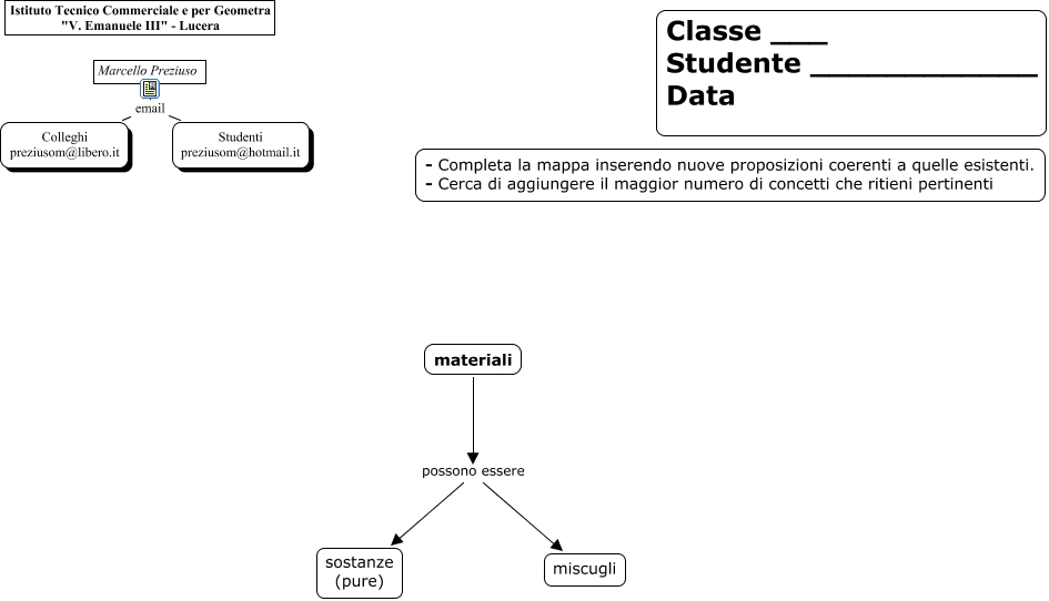 Questa Cmap, creata con IHMC CmapTools, contiene informazioni relative a: Miscugli e sostanze - C1- START, Marcello Preziuso email Studenti preziusom@hotmail.it, Marcello Preziuso email Colleghi preziusom@libero.it, materiali possono essere sostanze (pure), materiali possono essere miscugli