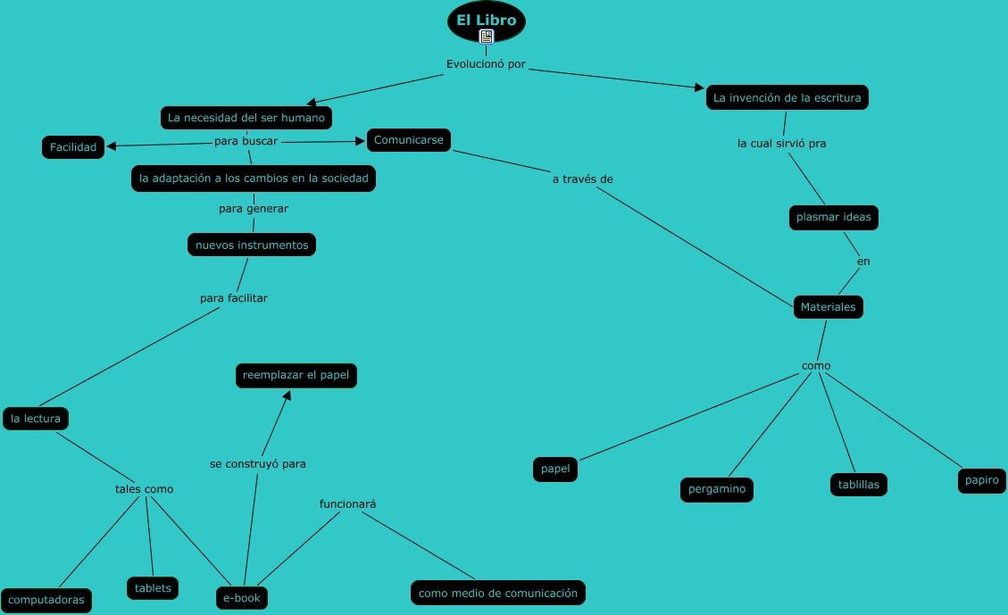 Este Cmap, tiene información relacionada con: el libro, La necesidad del ser humano para buscar Facilidad, La invención de la escritura la cual sirvió pra plasmar ideas, e-book funcionará como medio de comunicación, plasmar ideas en Materiales, La necesidad del ser humano para buscar Comunicarse, Comunicarse a través de Materiales, La necesidad del ser humano para buscar la adaptación a los cambios en la sociedad, El Libro Evolucionó por La necesidad del ser humano, Materiales como papel, la lectura tales como e-book, e-book se construyó para reemplazar el papel, El Libro Evolucionó por La invención de la escritura, la lectura tales como computadoras, Materiales como pergamino, Materiales como papiro, nuevos instrumentos para facilitar la lectura, la adaptación a los cambios en la sociedad para generar nuevos instrumentos, la lectura tales como tablets, Materiales como tablillas