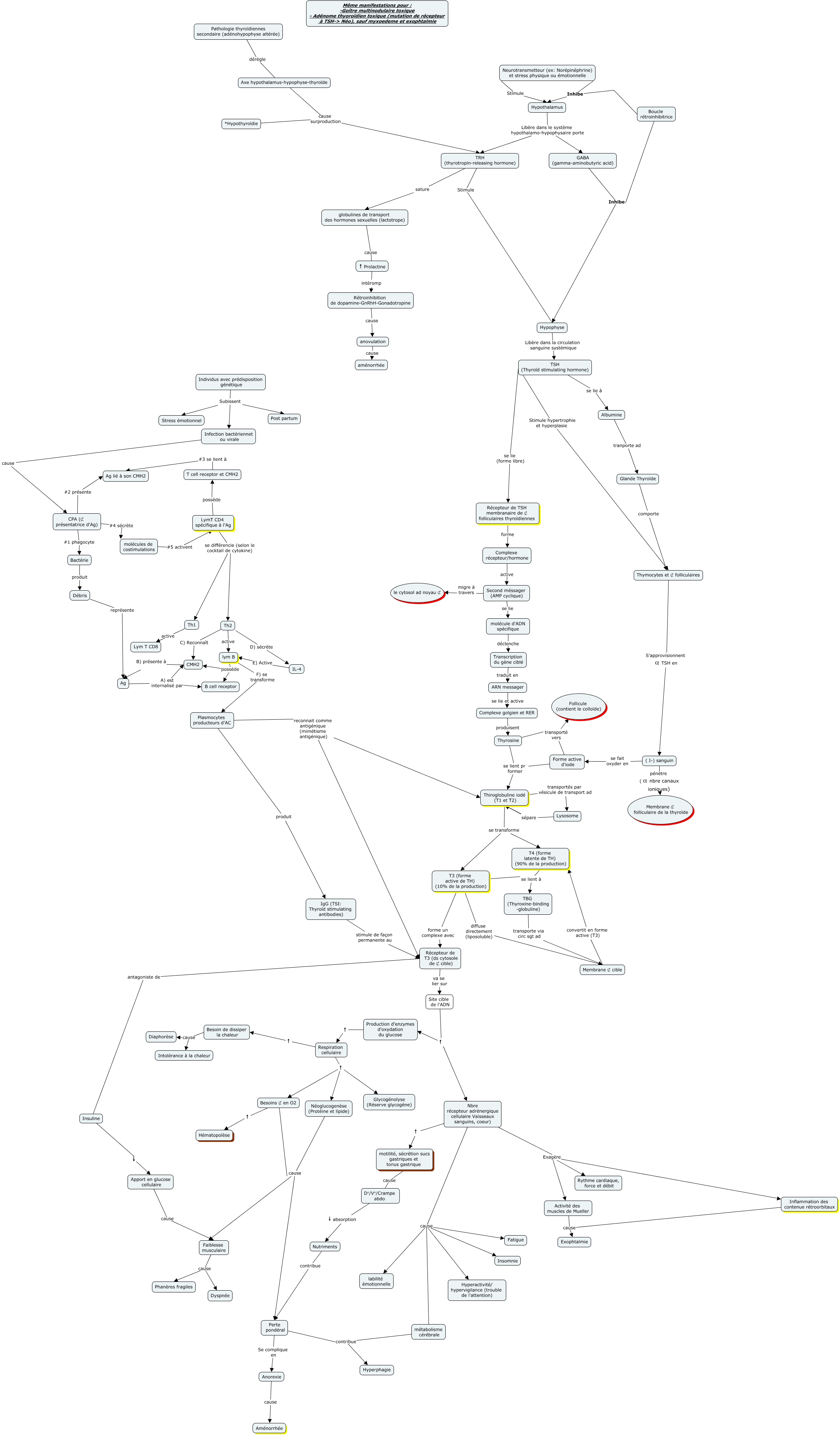 Cette carte de concepts créée avec IHMC CmapTools traite de: Hyperthyroïdie finale_Jé, Nbre récepteur adrénergique cellulaire Vaisseaux sanguins, coeur) cause labilité émotionnelle, TBG (Thyroxine-binding -globuline) transporte via circ sgt ad Membrane ⊄ cible, métabolisme cérébrale cause Insomnie, TSH (Thyroïd stimulating hormone) se lie à Albumine, Faiblesse musculaire cause Phanères fragiles, Récepteur de T3 (ds cytosole de ⊄ cible) antagoniste de Insuline, Nbre récepteur adrénergique cellulaire Vaisseaux sanguins, coeur) Exagère Inflammation des contenue rétroorbitaux, Plasmocytes producteurs d'AC produit IgG (TSI: Thyroïd stimulating antibodies), Complexe golgien et RER produisent Thyrosine, Second méssager (AMP cyclique) se lie molécule d'ADN spécifique, T4 (forme latente de TH) (90% de la production) se lient à TBG (Thyroxine-binding -globuline), Site cible de l'ADN ↑ Production d'enzymes d'oxydation du glucose, Glande Thyroïde comporte Thymocytes et ⊄ folliculaires, CPA (⊄ présentatrice d'Ag) #2 présente Ag lié à son CMH2, D°/V°/Crampe abdo ↓ absorption Nutriments, Hypothalamus Libère dans le système hypothalamo-hypophysaire porte GABA (gamma-aminobutyric acid), Perte pondéral contribue Hyperphagie, Second méssager (AMP cyclique) migre à travers le cytosol ad noyau ⊄, Thyrosine transporté vers Follicule (contient le colloïde), Th1 active Lym T CD8