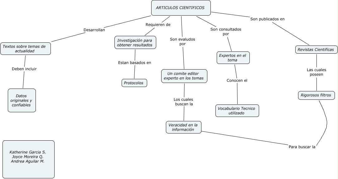 Este Cmap, tiene información relacionada con: CORREGIDO Articulos Cientificos KA,JOY,ANDRE, Textos sobre temas de actualidad Deben incluir Datos originales y confiables, Investigación para obtener resultados Estan basados en Protocolos, ARTICULOS CIENTIFICOS Son publicados en Revistas Cientificas, ARTICULOS CIENTIFICOS Desarrollan Textos sobre temas de actualidad, ARTICULOS CIENTIFICOS Requieren de Investigación para obtener resultados, Revistas Cientificas Las cuales poseen Rigorosos filtros, Rigorosos filtros Para buscar la ????, ARTICULOS CIENTIFICOS Son evaludos por Un comite editor experto en los temas, ARTICULOS CIENTIFICOS Son consultados por Expertos en el tema, Expertos en el tema Conocen el Vocabulario Tecnico utilizado, Un comite editor experto en los temas Los cuales buscan la Veracidad en la información
