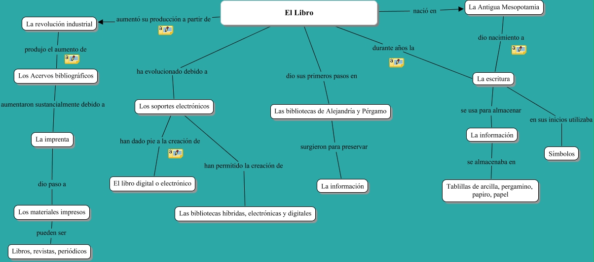 Este Cmap, tiene información relacionada con: Desarrollo del libro. Itza. CORREGIDO, La Antigua Mesopotamia dio nacimiento a La escritura, El Libro durante años la La escritura, Los Acervos bibliográficos aumentaron sustancialmente debido a La imprenta, Las bibliotecas de Alejandría y Pérgamo surgieron para preservar La información, La información se almacenaba en Tablillas de arcilla, pergamino, papiro, papel, La escritura en sus inicios utilizaba Símbolos, La revolución industrial produjo el aumento de Los Acervos bibliográficos, El Libro dio sus primeros pasos en Las bibliotecas de Alejandría y Pérgamo, Los materiales impresos pueden ser Libros, revistas, periódicos, El Libro nació en La Antigua Mesopotamia, La escritura se usa para almacenar La información, Los soportes electrónicos han dado pie a la creación de El libro digital o electrónico, El Libro aumentó su producción a partir de La revolución industrial, La imprenta dio paso a Los materiales impresos, El Libro ha evolucionado debido a Los soportes electrónicos, Los soportes electrónicos han permitido la creación de Las bibliotecas híbridas, electrónicas y digitales