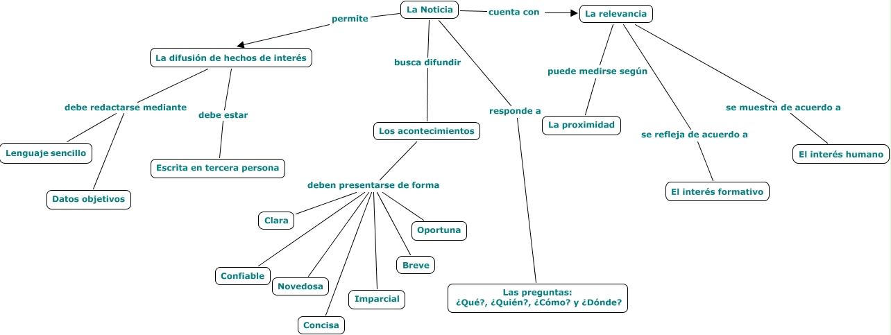 This Concept Map, created with IHMC CmapTools, has information related to: Características Noticia. Itza y Pedro, Los acontecimientos deben presentarse de forma Novedosa, La relevancia se muestra de acuerdo a El interés humano, Los acontecimientos deben presentarse de forma Imparcial, La Noticia responde a Las preguntas: ¿Qué?, ¿Quién?, ¿Cómo? y ¿Dónde?, La relevancia se refleja de acuerdo a El interés formativo, Los acontecimientos deben presentarse de forma Concisa, La difusión de hechos de interés debe estar Escrita en tercera persona, Los acontecimientos deben presentarse de forma Confiable, La Noticia busca difundir Los acontecimientos, La difusión de hechos de interés debe redactarse mediante Datos objetivos, Los acontecimientos deben presentarse de forma Clara, La Noticia permite La difusión de hechos de interés, La difusión de hechos de interés debe redactarse mediante Lenguaje sencillo, Los acontecimientos deben presentarse de forma Breve, La relevancia puede medirse según La proximidad, La Noticia cuenta con La relevancia, Los acontecimientos deben presentarse de forma Oportuna