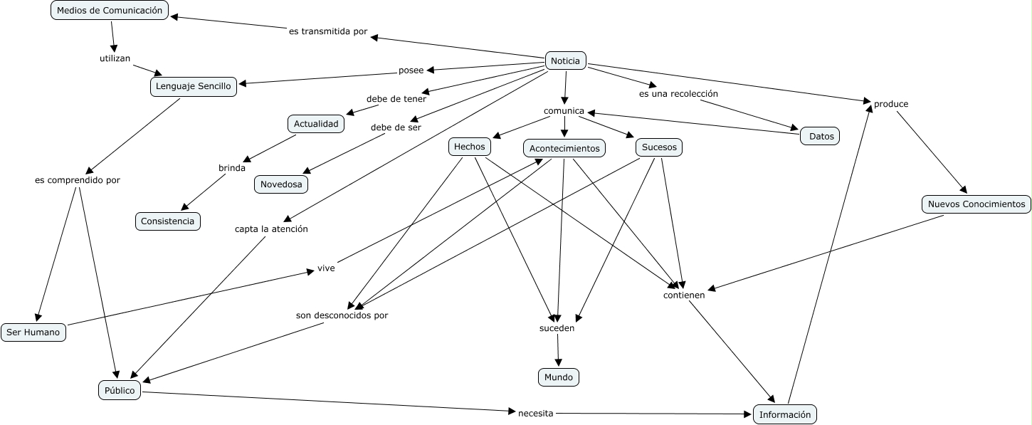 Este Cmap, tiene información relacionada con: Mapa Noticia - Adrián - Laura - Marianella, Público necesita Información, Medios de Comunicación utilizan Lenguaje Sencillo, Datos comunica Sucesos, Noticia comunica Acontecimientos, Noticia debe de tener Actualidad, Noticia es transmitida por Medios de Comunicación, Noticia produce Nuevos Conocimientos, Actualidad brinda Consistencia, Ser Humano vive Acontecimientos, Datos comunica Acontecimientos, Sucesos son desconocidos por Público, Datos comunica Hechos, Nuevos Conocimientos contienen Información, Acontecimientos contienen Información, Noticia es una recolección Datos, Hechos son desconocidos por Público, Información produce Nuevos Conocimientos, Hechos suceden Mundo, Lenguaje Sencillo es comprendido por Público, Lenguaje Sencillo es comprendido por Ser Humano