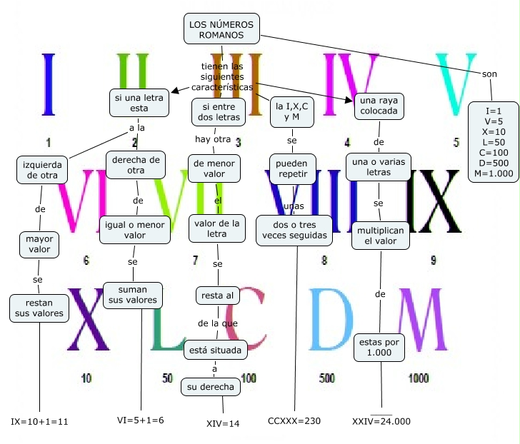 Este Cmap, tiene información relacionada con: LOS NÚMEROS ROMANOS(Manuela y Paloma), una raya colocada de una o varias letras, LOS NÚMEROS ROMANOS tienen las siguientes características si entre dos letras, LOS NÚMEROS ROMANOS tienen las siguientes características la I,X,C y M, dos o tres veces seguidas ???? CCXXX=230, derecha de otra de igual o menor valor, si una letra esta a la derecha de otra, estas por 1.000 ???? ____ XXIV=24.000, una o varias letras se multiplican el valor, mayor valor se restan sus valores, LOS NÚMEROS ROMANOS son I=1 V=5 X=10 L=50 C=100 D=500 M=1.000, si una letra esta a la izquierda de otra, izquierda de otra de mayor valor, valor de la letra se resta al, la I,X,C y M se pueden repetir, igual o menor valor se suman sus valores, si entre dos letras hay otra de menor valor, su derecha ???? XIV=14, está situada a su derecha, multiplican el valor de estas por 1.000, de menor valor el valor de la letra