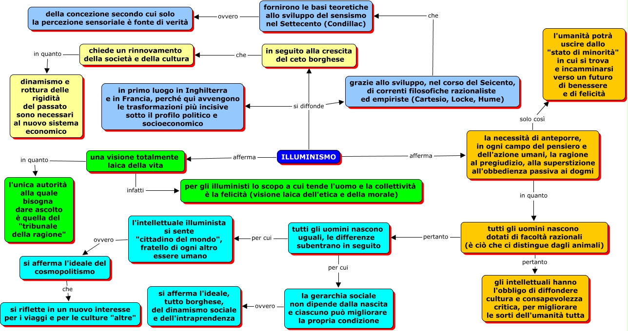 Questa Cmap, creata con IHMC CmapTools, contiene informazioni relative a: L'illuminismo, tutti gli uomini nascono dotati di facoltà razionali (è ciò che ci distingue dagli animali) pertanto gli intellettuali hanno l'obbligo di diffondere cultura e consapevolezza critica, per migliorare le sorti dell'umanità tutta, ILLUMINISMO si diffonde grazie allo sviluppo, nel corso del Seicento, di correnti filosofiche razionaliste ed empiriste (Cartesio, Locke, Hume), tutti gli uomini nascono uguali, le differenze subentrano in seguito per cui l'intellettuale illuminista si sente "cittadino del mondo", fratello di ogni altro essere umano, l'intellettuale illuminista si sente "cittadino del mondo", fratello di ogni altro essere umano ovvero si afferma l'ideale del cosmopolitismo, la necessità di anteporre, in ogni campo del pensiero e dell'azione umani, la ragione al pregiudizio, alla superstizione all'obbedienza passiva ai dogmi solo così l'umanità potrà uscire dallo "stato di minorità" in cui si trova e incamminarsi verso un futuro di benessere e di felicità, fornirono le basi teoretiche allo sviluppo del sensismo nel Settecento (Condillac) ovvero della concezione secondo cui solo la percezione sensoriale è fonte di verità, ILLUMINISMO si diffonde in seguito alla crescita del ceto borghese, chiede un rinnovamento della società e della cultura in quanto dinamismo e rottura delle rigidità del passato sono necessari al nuovo sistema economico, tutti gli uomini nascono uguali, le differenze subentrano in seguito per cui la gerarchia sociale non dipende dalla nascita e ciascuno può migliorare la propria condizione, la gerarchia sociale non dipende dalla nascita e ciascuno può migliorare la propria condizione ovvero si afferma l'ideale, tutto borghese, del dinamismo sociale e dell'intraprendenza, tutti gli uomini nascono dotati di facoltà razionali (è ciò che ci distingue dagli animali) pertanto tutti gli uomini nascono uguali, le differenze subentrano in seguito, ILLUMINISMO si diffonde in primo luogo in Inghilterra e in Francia, perché qui avvengono le trasformazioni più incisive sotto il profilo politico e socioeconomico, ILLUMINISMO afferma la necessità di anteporre, in ogni campo del pensiero e dell'azione umani, la ragione al pregiudizio, alla superstizione all'obbedienza passiva ai dogmi, ILLUMINISMO afferma una visione totalmente laica della vita, in seguito alla crescita del ceto borghese che chiede un rinnovamento della società e della cultura, la necessità di anteporre, in ogni campo del pensiero e dell'azione umani, la ragione al pregiudizio, alla superstizione all'obbedienza passiva ai dogmi in quanto tutti gli uomini nascono dotati di facoltà razionali (è ciò che ci distingue dagli animali), una visione totalmente laica della vita infatti per gli illuministi lo scopo a cui tende l'uomo e la collettività è la felicità (visione laica dell'etica e della morale), grazie allo sviluppo, nel corso del Seicento, di correnti filosofiche razionaliste ed empiriste (Cartesio, Locke, Hume) che fornirono le basi teoretiche allo sviluppo del sensismo nel Settecento (Condillac), si afferma l'ideale del cosmopolitismo che si riflette in un nuovo interesse per i viaggi e per le culture "altre", una visione totalmente laica della vita in quanto l'unica autorità alla quale bisogna dare ascolto è quella del "tribunale della ragione"