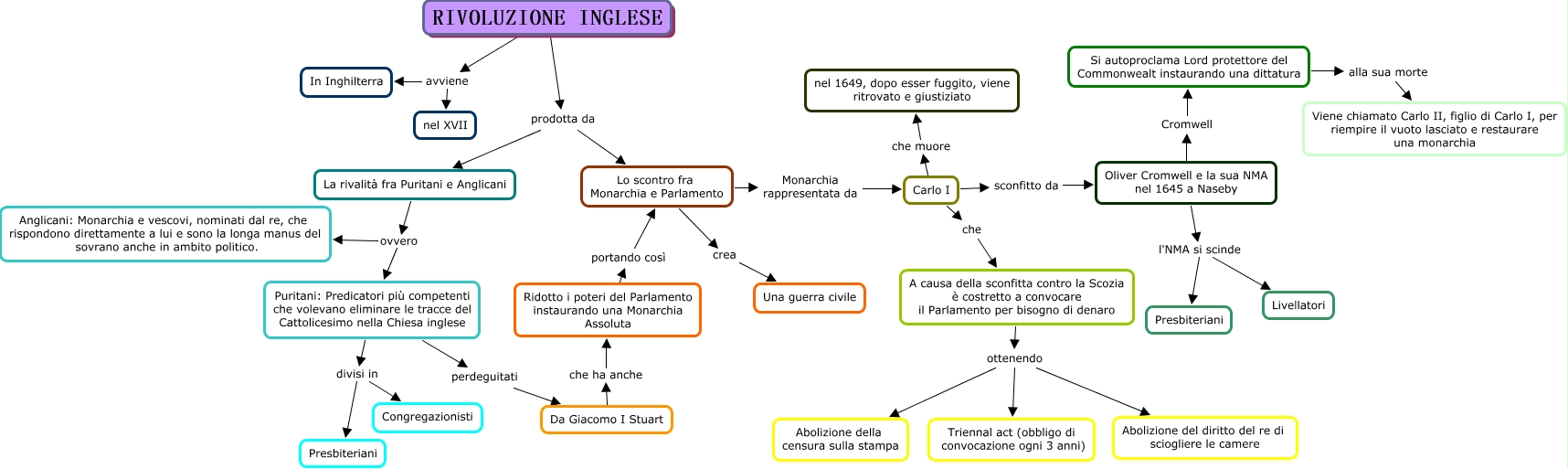 Questa Cmap, creata con IHMC CmapTools, contiene informazioni relative a: Rivoluzione Inglese - D'Aniello, Lo scontro fra Monarchia e Parlamento crea Una guerra civile, A causa della sconfitta contro la Scozia è costretto a convocare il Parlamento per bisogno di denaro ottenendo Abolizione della censura sulla stampa, RIVOLUZIONE INGLESE avviene In Inghilterra, Puritani: Predicatori più competenti che volevano eliminare le tracce del Cattolicesimo nella Chiesa inglese divisi in Presbiteriani, Oliver Cromwell e la sua NMA nel 1645 a Naseby l'NMA si scinde Presbiteriani, Da Giacomo I Stuart che ha anche Ridotto i poteri del Parlamento instaurando una Monarchia Assoluta, Carlo I che A causa della sconfitta contro la Scozia è costretto a convocare il Parlamento per bisogno di denaro, RIVOLUZIONE INGLESE avviene nel XVII, RIVOLUZIONE INGLESE prodotta da La rivalità fra Puritani e Anglicani, Puritani: Predicatori più competenti che volevano eliminare le tracce del Cattolicesimo nella Chiesa inglese perdeguitati Da Giacomo I Stuart, Lo scontro fra Monarchia e Parlamento Monarchia rappresentata da Carlo I, A causa della sconfitta contro la Scozia è costretto a convocare il Parlamento per bisogno di denaro ottenendo Triennal act (obbligo di convocazione ogni 3 anni), Si autoproclama Lord protettore del Commonwealt instaurando una dittatura alla sua morte Viene chiamato Carlo II, figlio di Carlo I, per riempire il vuoto lasciato e restaurare una monarchia, Oliver Cromwell e la sua NMA nel 1645 a Naseby Cromwell Si autoproclama Lord protettore del Commonwealt instaurando una dittatura, Carlo I sconfitto da Oliver Cromwell e la sua NMA nel 1645 a Naseby, Carlo I che muore nel 1649, dopo esser fuggito, viene ritrovato e giustiziato, A causa della sconfitta contro la Scozia è costretto a convocare il Parlamento per bisogno di denaro ottenendo Abolizione del diritto del re di sciogliere le camere, La rivalità fra Puritani e Anglicani ovvero Puritani: Predicatori più competenti che volevano eliminare le tracce del Cattolicesimo nella Chiesa inglese, Puritani: Predicatori più competenti che volevano eliminare le tracce del Cattolicesimo nella Chiesa inglese divisi in Congregazionisti, Oliver Cromwell e la sua NMA nel 1645 a Naseby l'NMA si scinde Livellatori