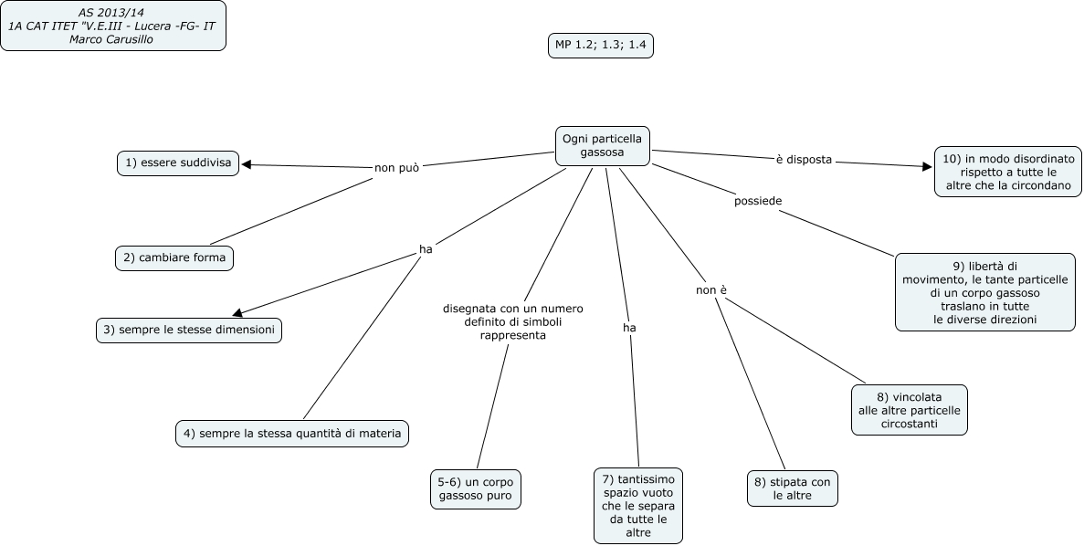 Questa Cmap, creata con IHMC CmapTools, contiene informazioni relative a: MP 2.1 modello particellare (per rappresentare un corpo gassoso), Ogni particella gassosa non è 8) vincolata alle altre particelle circostanti, Ogni particella gassosa non può 1) essere suddivisa, Ogni particella gassosa non può 2) cambiare forma, Ogni particella gassosa è disposta 10) in modo disordinato rispetto a tutte le altre che la circondano, Ogni particella gassosa ha 3) sempre le stesse dimensioni, Ogni particella gassosa disegnata con un numero definito di simboli rappresenta 5-6) un corpo gassoso puro, Ogni particella gassosa non è 8) stipata con le altre, Ogni particella gassosa ha 4) sempre la stessa quantità di materia, Ogni particella gassosa ha 7) tantissimo spazio vuoto che le separa da tutte le altre, Ogni particella gassosa possiede 9) libertà di movimento, le tante particelle di un corpo gassoso traslano in tutte le diverse direzioni