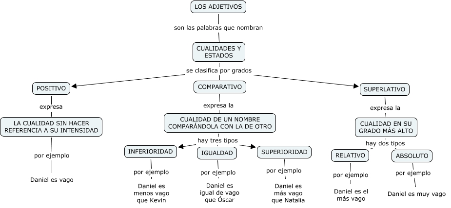 Este Cmap, tiene información relacionada con: EL ADJETIVO Y SUS GRADOS (Daniel), INFERIORIDAD por ejemplo Daniel es menos vago que Kevin, CUALIDADES Y ESTADOS se clasifica por grados POSITIVO, CUALIDAD EN SU GRADO MÁS ALTO hay dos tipos ABSOLUTO, CUALIDAD DE UN NOMBRE COMPARÁNDOLA CON LA DE OTRO hay tres tipos SUPERIORIDAD, POSITIVO expresa LA CUALIDAD SIN HACER REFERENCIA A SU INTENSIDAD, IGUALDAD por ejemplo Daniel es igual de vago que Óscar, CUALIDADES Y ESTADOS se clasifica por grados COMPARATIVO, LOS ADJETIVOS son las palabras que nombran CUALIDADES Y ESTADOS, CUALIDAD DE UN NOMBRE COMPARÁNDOLA CON LA DE OTRO hay tres tipos IGUALDAD, SUPERIORIDAD por ejemplo Daniel es más vago que Natalia, CUALIDADES Y ESTADOS se clasifica por grados SUPERLATIVO, RELATIVO por ejemplo Daniel es el más vago, COMPARATIVO expresa la CUALIDAD DE UN NOMBRE COMPARÁNDOLA CON LA DE OTRO, SUPERLATIVO expresa la CUALIDAD EN SU GRADO MÁS ALTO, CUALIDAD DE UN NOMBRE COMPARÁNDOLA CON LA DE OTRO hay tres tipos INFERIORIDAD, CUALIDAD EN SU GRADO MÁS ALTO hay dos tipos RELATIVO, LA CUALIDAD SIN HACER REFERENCIA A SU INTENSIDAD por ejemplo Daniel es vago, ABSOLUTO por ejemplo Daniel es muy vago
